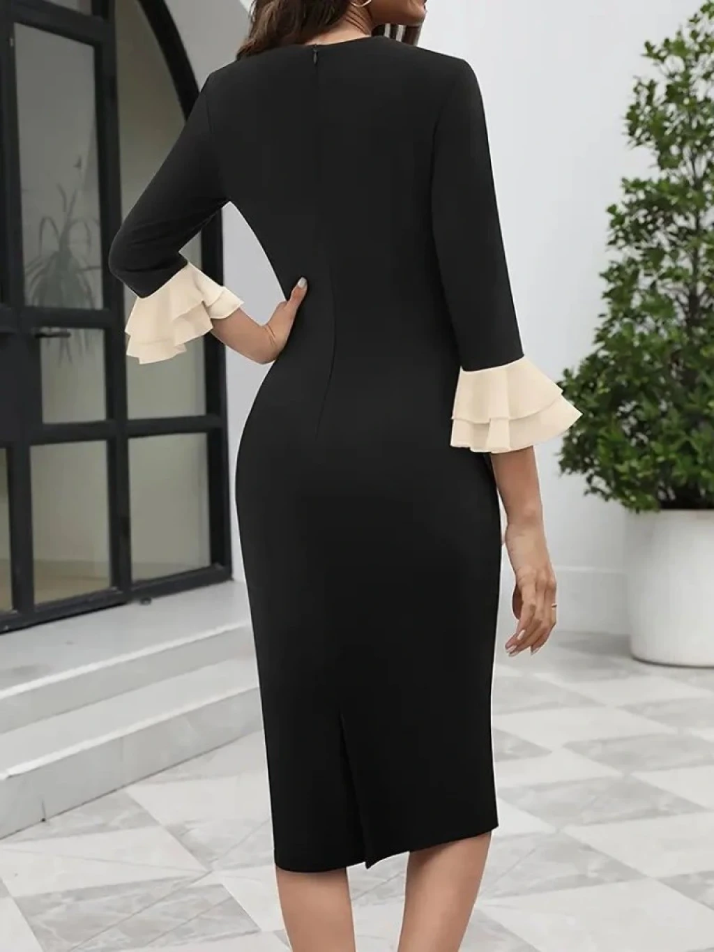 Kadın Truvakar Kollu Fiyonk Yakalı Midi Ithal Krep Elbise