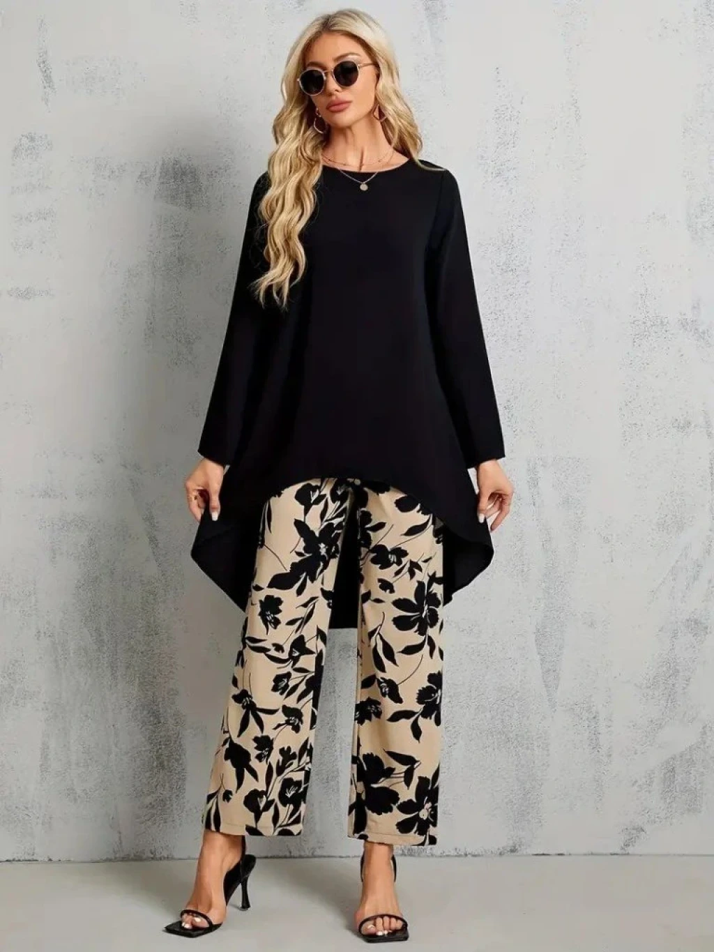 Kadın Uzun Kollu Bisiklet Yaka Asimetrik Kesim Detaylı Viskon Bluz Ve çiçek Desenli Iki Iplik Pantolon