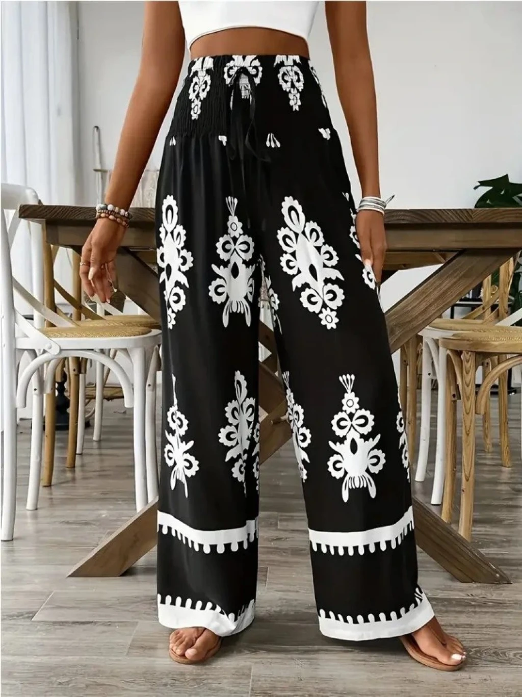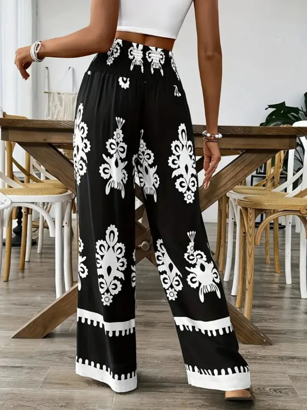 Kadın Yüksek Bel Büzgülü Etnik Desen Baskılı Süprem Pantolon