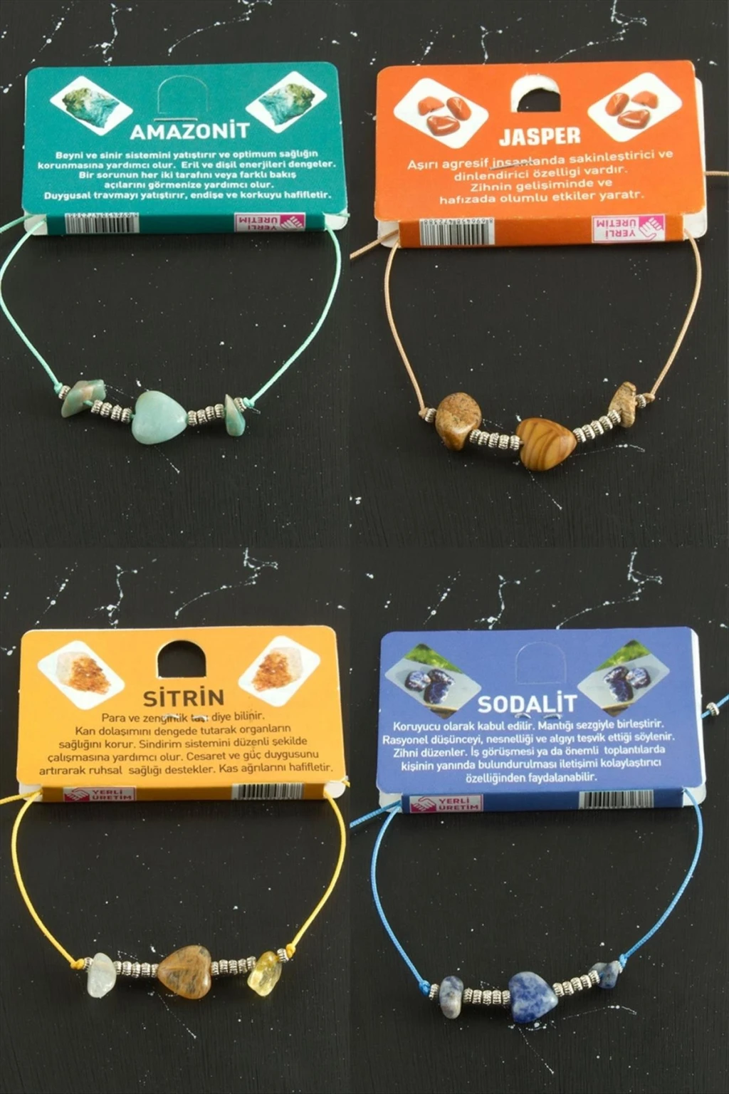 Bileklik, Ürün malzemesi doğaltaş ve iptir. Ürün arkası makrome örmedir. Bileğe göre yarlanabilir. Doğaltaşlar ve renkleri karışık olarak gönderilecektir.