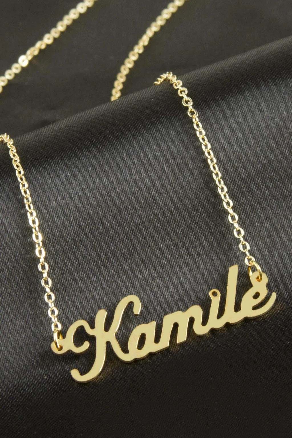 Kamile isimli kolye. İsimli kolye pirinç madeninden ve altın kaplamalıdır. Kişiye özel üretilmektedir.Yazdırmak istediğiniz ismi bize mesaj olarak iletmeniz gerekmektedir. Kullanıma bağlı olarak uzun süre kullanıma uygundur. Ürün malzemesi 1.sınıf kalitededir. Ürün ve zinciri sarı renktedir. Ürün zincir boyu 45 cm ve ürün üzerindeki isimler yaklaşık 3 cmdir. İsim boyları ürün ismine göre degişiklik göstermektedir.