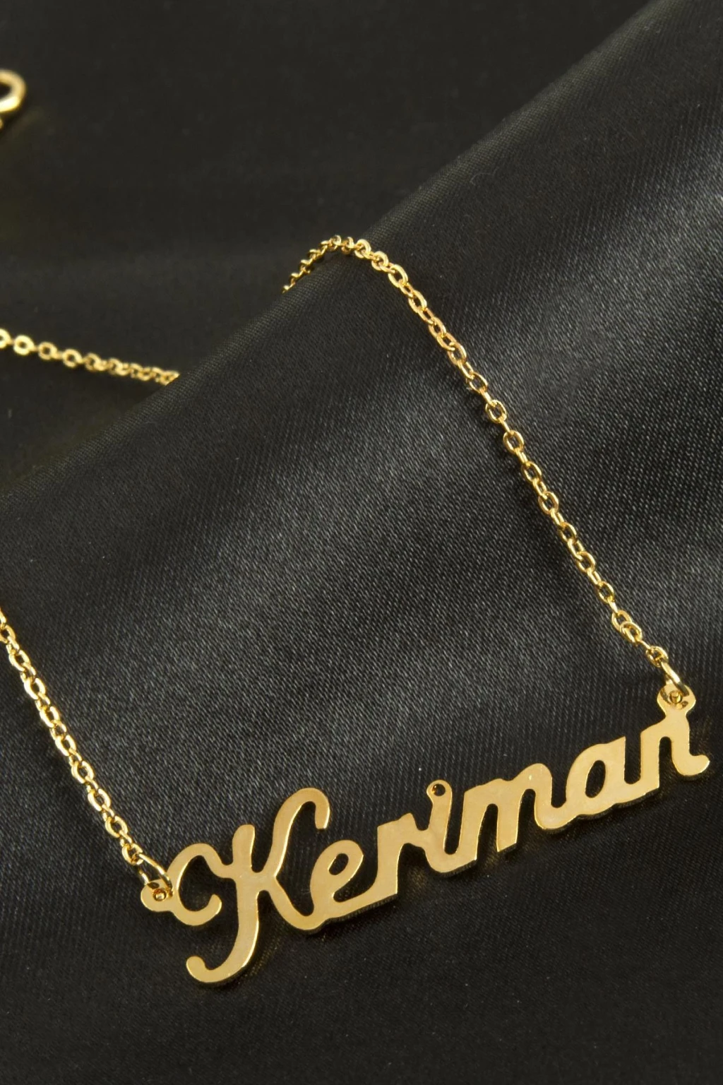 Keriman isimli kolye. İsimli kolye pirinç madeninden ve altın kaplamalıdır. Kişiye özel üretilmektedir.Yazdırmak istediğiniz ismi bize mesaj olarak iletmeniz gerekmektedir. Kullanıma bağlı olarak uzun süre kullanıma uygundur. Ürün malzemesi 1.sınıf kalitededir. Ürün ve zinciri sarı renktedir. Ürün zincir boyu 45 cm ve ürün üzerindeki isimler yaklaşık 3 cmdir. İsim boyları ürün ismine göre degişiklik göstermektedir.