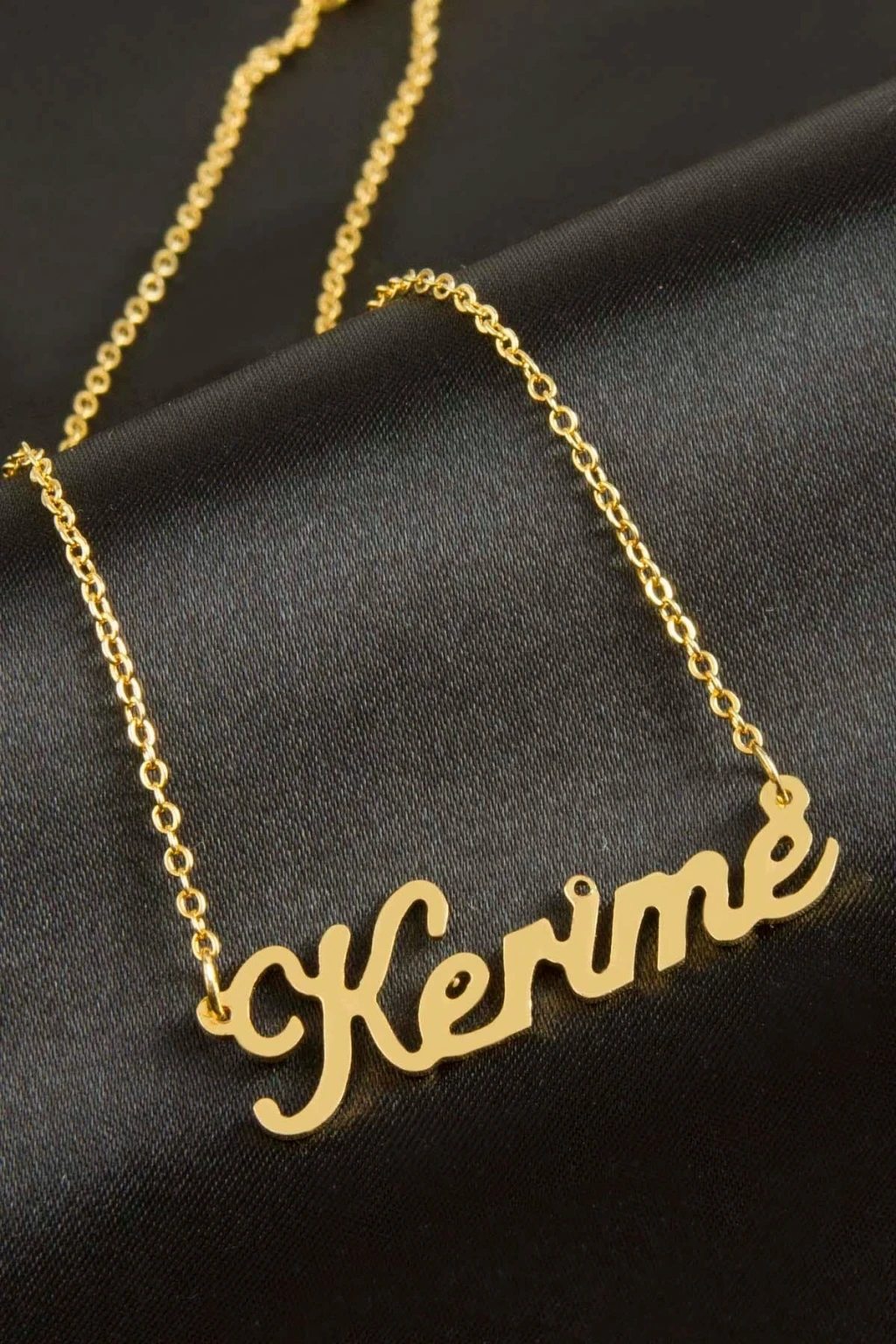 Kerime isimli kolye. İsimli kolye pirinç madeninden ve altın kaplamalıdır. Kişiye özel üretilmektedir.Yazdırmak istediğiniz ismi bize mesaj olarak iletmeniz gerekmektedir. Kullanıma bağlı olarak uzun süre kullanıma uygundur. Ürün malzemesi 1.sınıf kalitededir. Ürün ve zinciri sarı renktedir. Ürün zincir boyu 45 cm ve ürün üzerindeki isimler yaklaşık 3 cmdir. İsim boyları ürün ismine göre degişiklik göstermektedir.