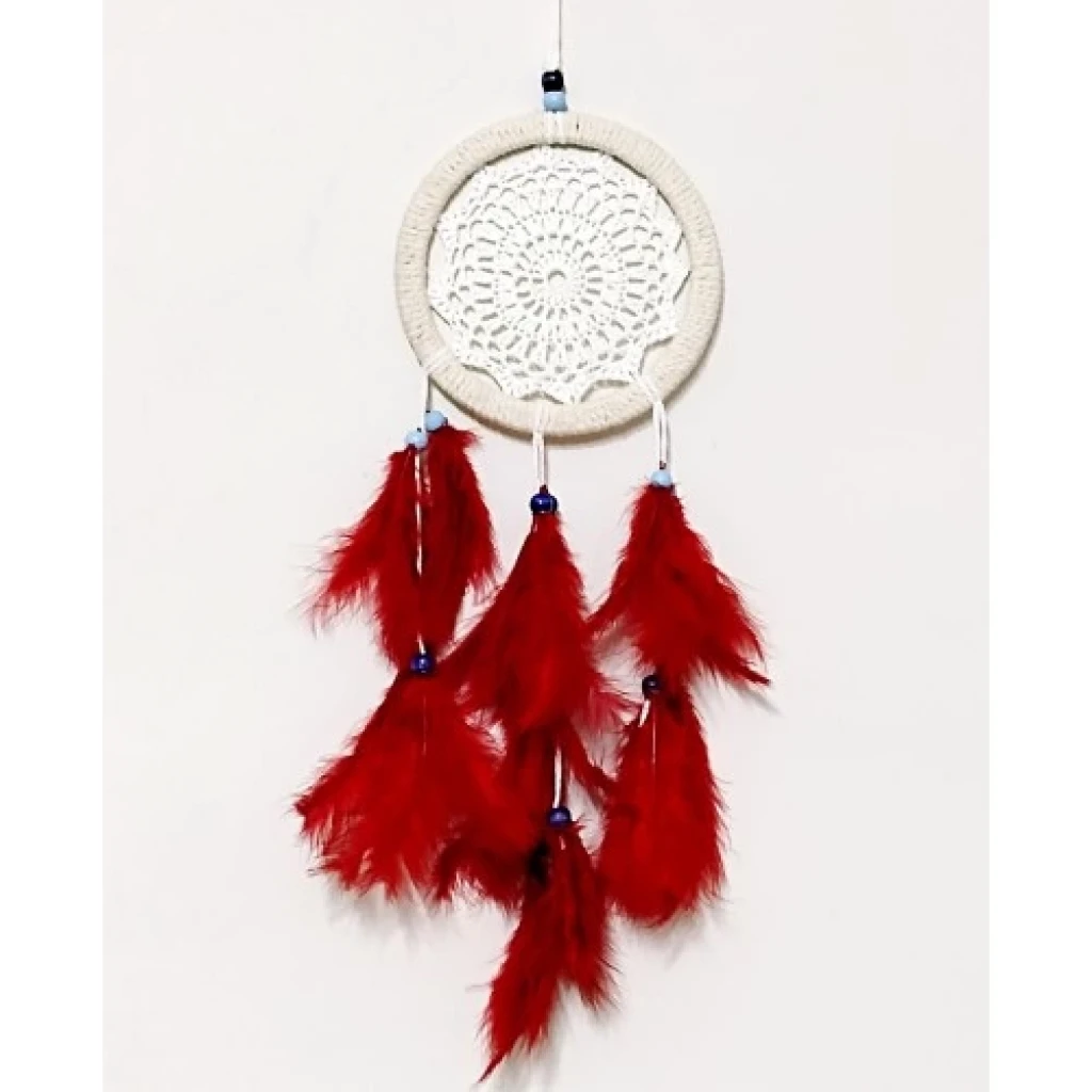 Krem rengi ürünümüzün yuvarlak kısmı 17 santimetre çapındadır. Ürünümüz ip dahil 60 santimetre boyundadır. Ürünümüz kırmızı kuş tüyleri ile süslenmiştir. Duvar süsümüz el yapımıdır.