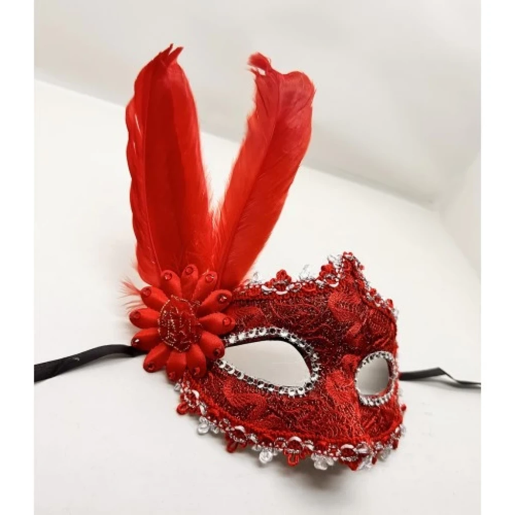Kırmızı Renk Tüylü Dantelli Gözleri Taşlı Balo Parti Maskesi