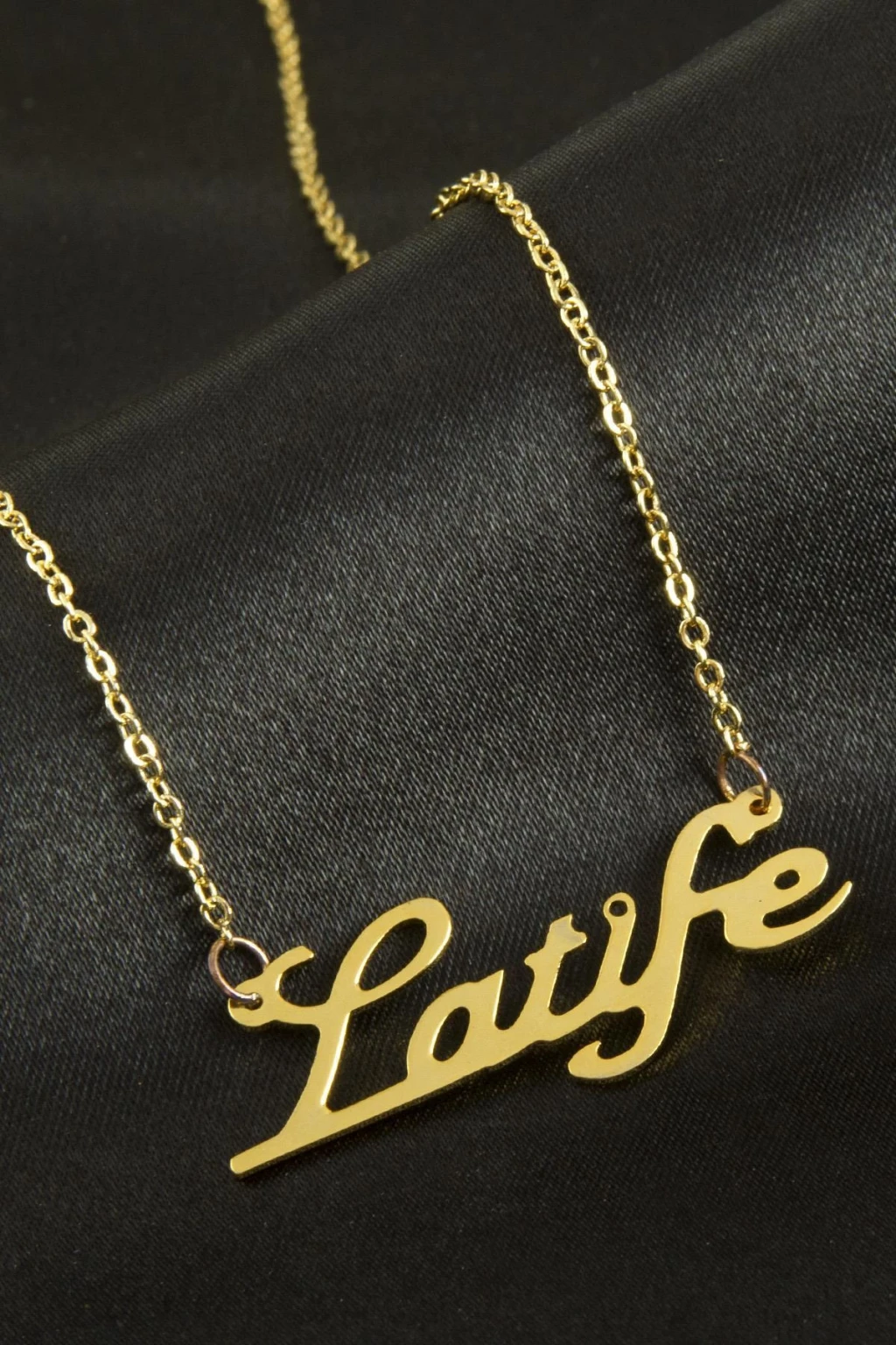 Latife isimli kolye. İsimli kolye pirinç madeninden ve altın kaplamalıdır. Kişiye özel üretilmektedir.Yazdırmak istediğiniz ismi bize mesaj olarak iletmeniz gerekmektedir. Kullanıma bağlı olarak uzun süre kullanıma uygundur. Ürün malzemesi 1.sınıf kalitededir. Ürün ve zinciri sarı renktedir. Ürün zincir boyu 45 cm ve ürün üzerindeki isimler yaklaşık 3 cmdir. İsim boyları ürün ismine göre degişiklik göstermektedir.