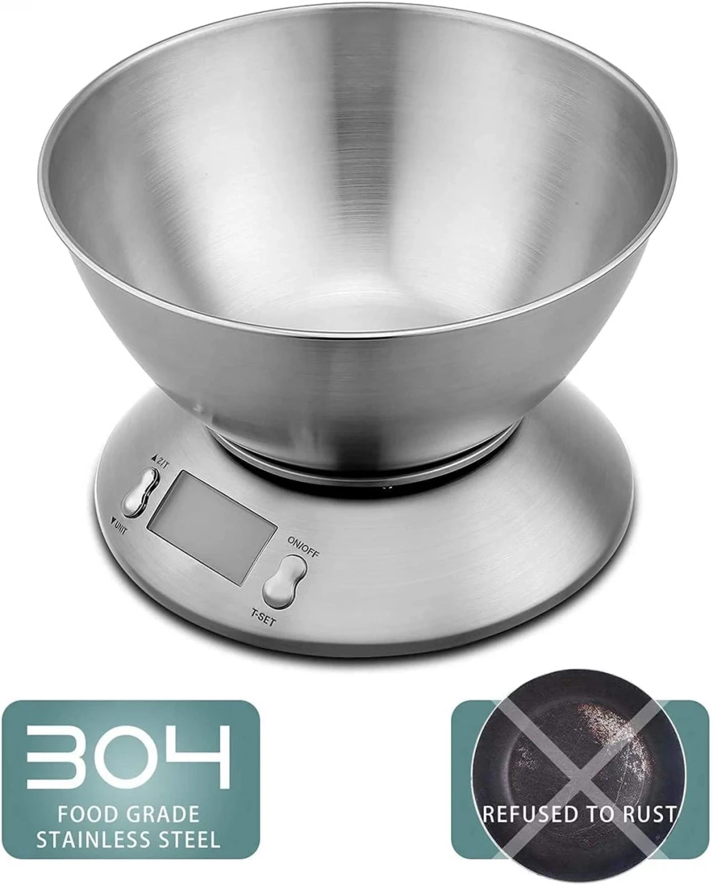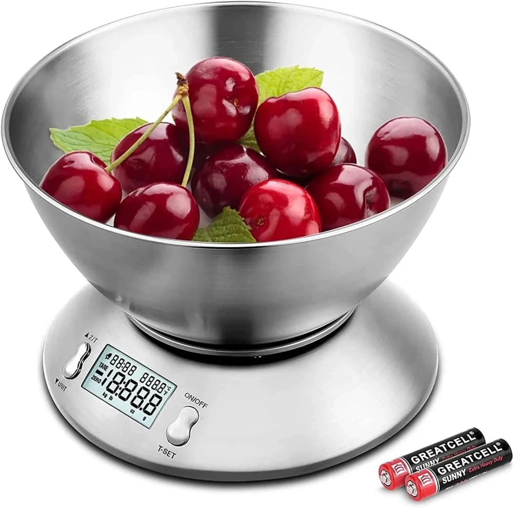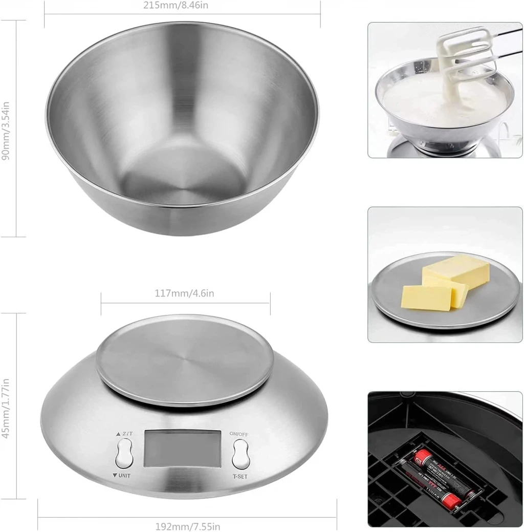 -Kolay tartım için ve her türlü malzemeyi kirletmeden yüksek ve geniş çıkarılabilir saten paslanmaz çelik kaseye sahiptir. -İstenirse, kase başka bir tabak veya kap ile değiştirilebilir. -Maksimum 5 kg kapasiteye sahiptir ve gram hassasiyeti sunar. -Açtığınızda, plaka üzerinde bir kase olsun veya olmasın, her zaman sıfıra kalibre edilir. -Bir malzemeyi tartarken sıfıra gidebilirsiniz. -Birçok özelliği arasında ölçüm birimi, termal ve sıcaklık sensörü, otomatik kapanma, aşırı yük göstergesi ve pil göstergesini seçme seçeneği de vardır. -Dijital zamanlayıcı, pişirme görevleri için çok uygundur, ancak terazinin çalışması ile ilgili değildir. -2 adet AAA mini kalemli pillerle çalışır.