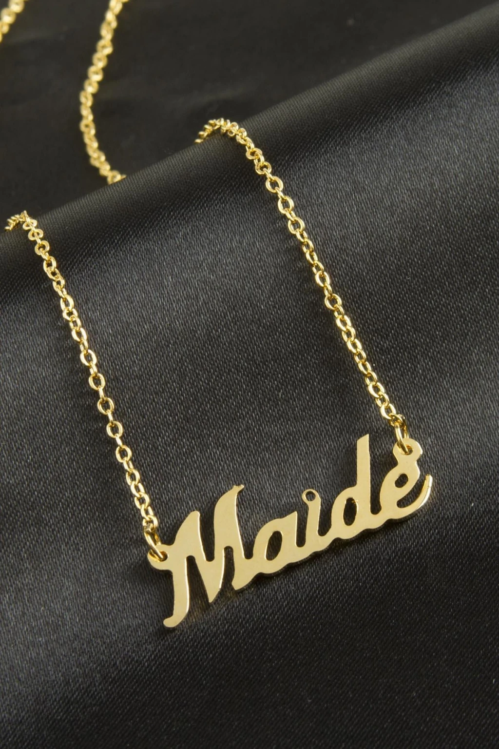 Maide isimli kolye. İsimli kolye pirinç madeninden ve altın kaplamalıdır. Kişiye özel üretilmektedir.Yazdırmak istediğiniz ismi bize mesaj olarak iletmeniz gerekmektedir. Kullanıma bağlı olarak uzun süre kullanıma uygundur. Ürün malzemesi 1.sınıf kalitededir. Ürün ve zinciri sarı renktedir. Ürün zincir boyu 45 cm ve ürün üzerindeki isimler yaklaşık 3 cmdir. İsim boyları ürün ismine göre degişiklik göstermektedir.