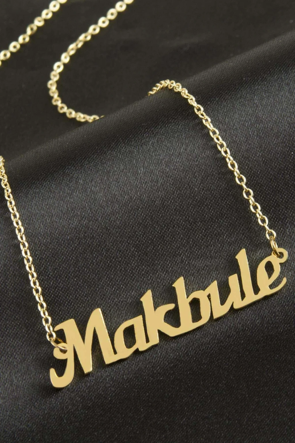 Makbule isimli kolye. İsimli kolye pirinç madeninden ve altın kaplamalıdır. Kişiye özel üretilmektedir.Yazdırmak istediğiniz ismi bize mesaj olarak iletmeniz gerekmektedir. Kullanıma bağlı olarak uzun süre kullanıma uygundur. Ürün malzemesi 1.sınıf kalitededir. Ürün ve zinciri sarı renktedir. Ürün zincir boyu 45 cm ve ürün üzerindeki isimler yaklaşık 3 cmdir. İsim boyları ürün ismine göre degişiklik göstermektedir.