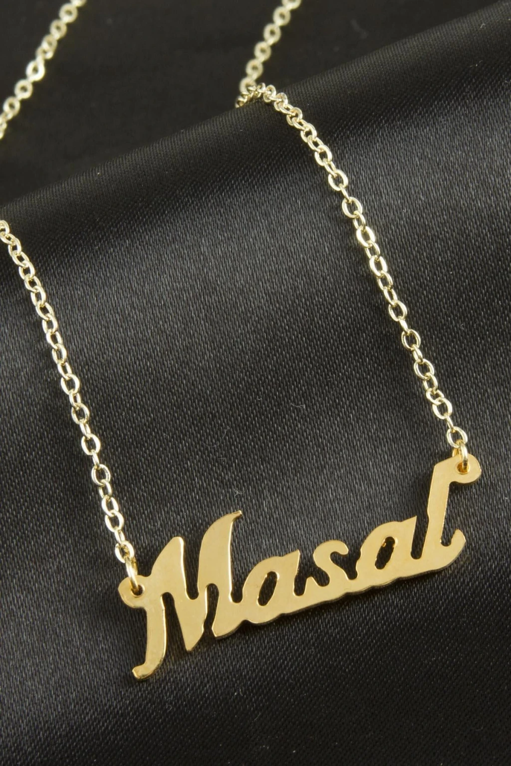 Masal İsimli Kolye. İsimli kolye pirinç madeninden ve altın kaplamalıdır. Kişiye özel üretilmektedir.Yazdırmak istediğiniz ismi bize mesaj olarak iletmeniz gerekmektedir. Kullanıma bağlı olarak uzun süre kullanıma uygundur. Ürün malzemesi 1.sınıf kalitededir. Ürün ve zinciri sarı renktedir. Ürün zincir boyu 45 cm ve ürün üzerindeki isimler yaklaşık 3 cmdir. İsim boyları ürün ismine göre degişiklik göstermektedir.