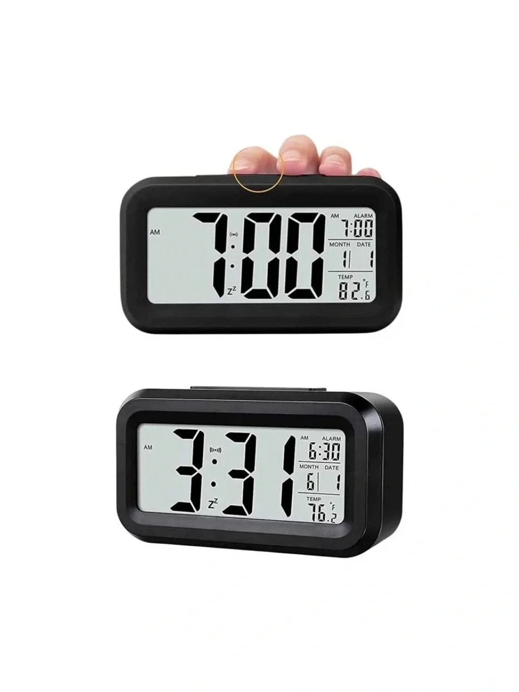 Büyük LCD ekranı, saati, tarihi ve ortam sıcaklığını net bir şekilde görüntülemenizi sağlar. Karanlık ortamlarda ekranın otomatik olarak aydınlanması, her zaman saatinizi rahatça okumanızı sağlar. 6 saniye sonra kendiliğinden kapanan ışık, enerji tasarrufu sağlarken, aynı zamanda uyku sırasında sizi rahatsız etmez.
