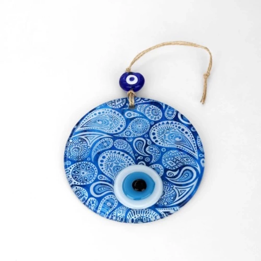 Mavi beyaz desenli ürünümüz 15 santimetre çapındadır. Cam nazar boncuğumuz tamamen el işçiliği ile özel tasarım olarak üretilmiştir. Ürünümüzü ister kendiniz için isterseniz sevdiklerinize hediye etmek için tercih edebilirsiniz.