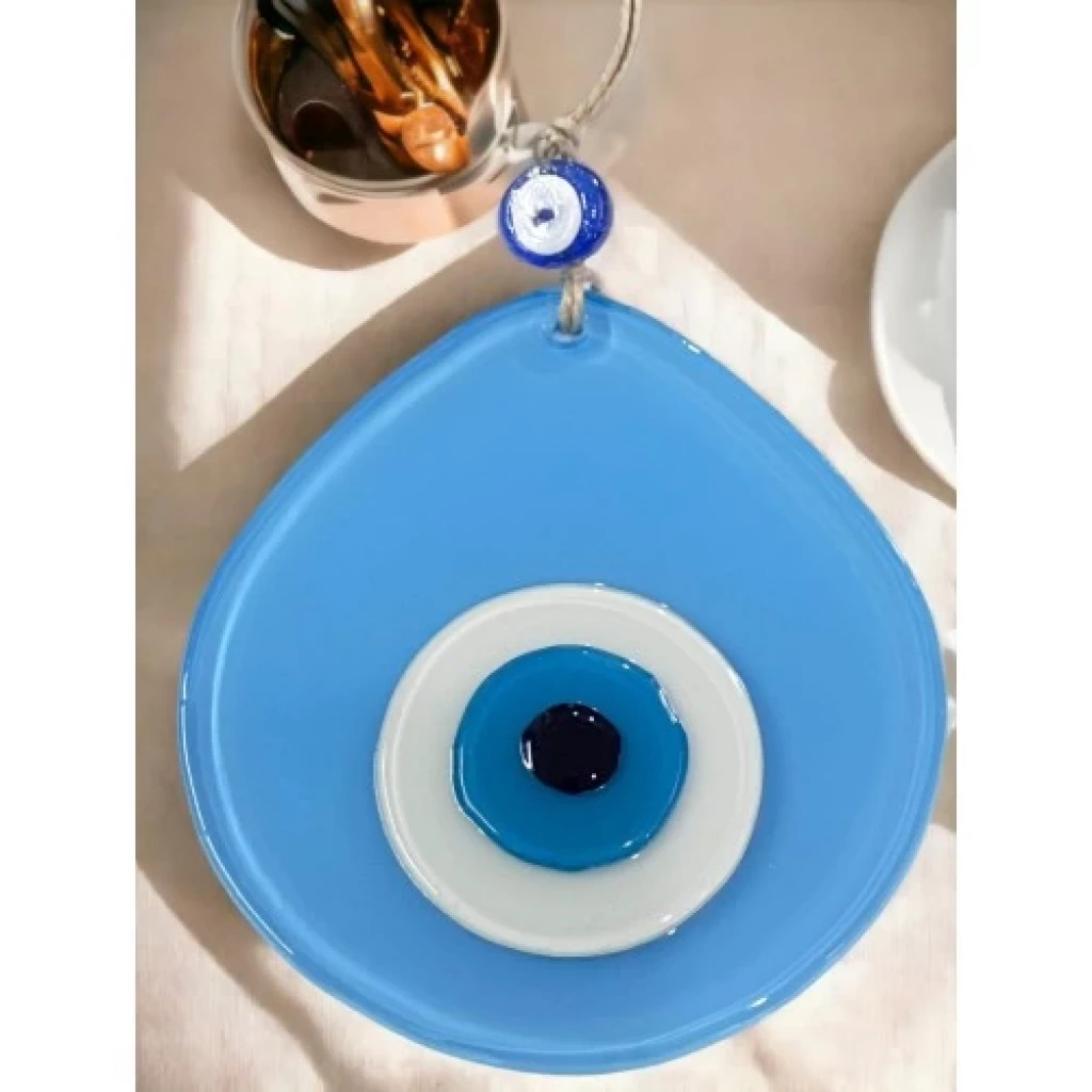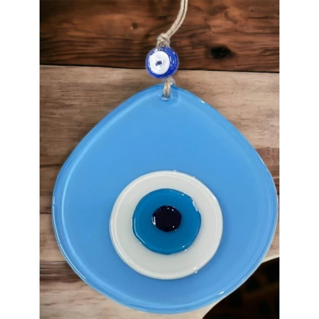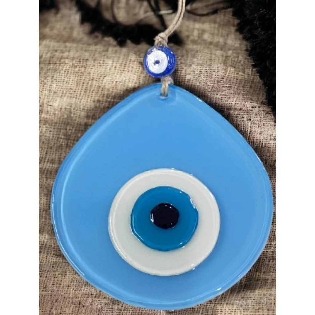 Açık Mavi renk nazar boncuklu duvar süsümüz tamamen el işçiliği ile üretilmiştir. Tasarım harikası el yapımı nazar boncuklu duvar süsümüz 13 x 12 santimetre ölçülerindedir. Ürünümüz ip dahil 21 santimetre boyundadır.