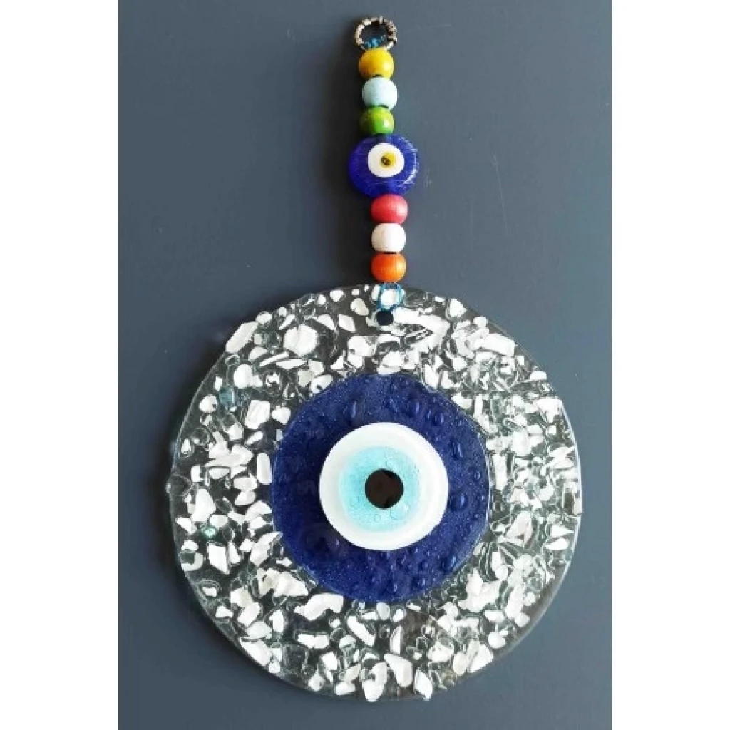 Mavi Nazar Boncuklu Beyaz Kesme Cam Desenli Duvar Süsü Nazarlık