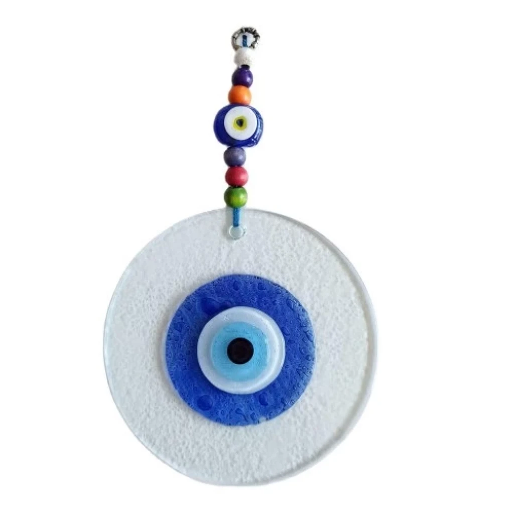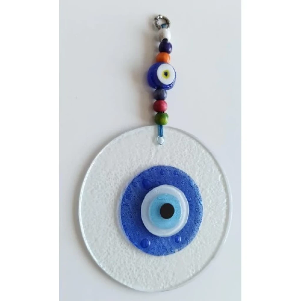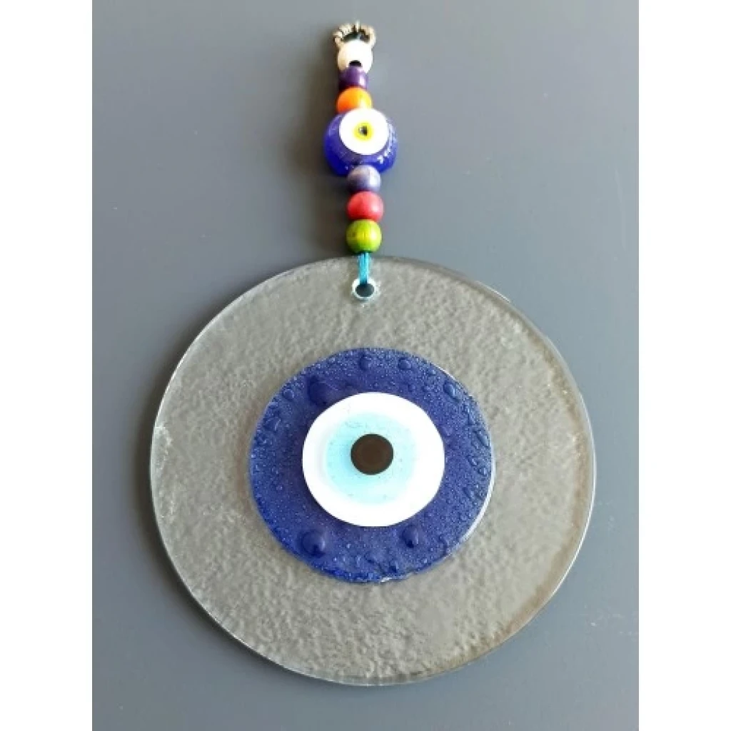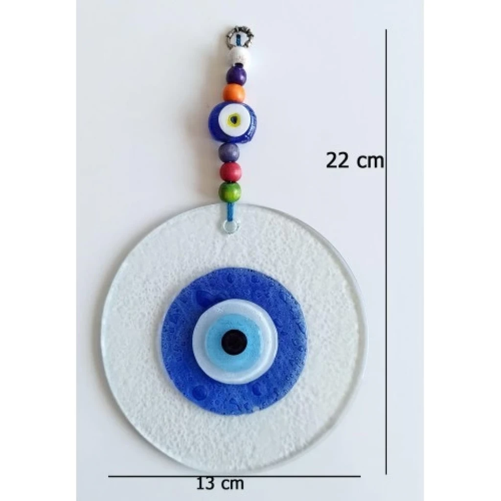 Mavi nazar boncuklu ürünümüz 13 santimetre çapındadır. Ürünümüz ip dahil yaklaşık 22 santimetre boyundadır. Ürünümüz el yapımıdır. Ürünümüz füzyon cam malzeme kullanılarak üretilmektedir.