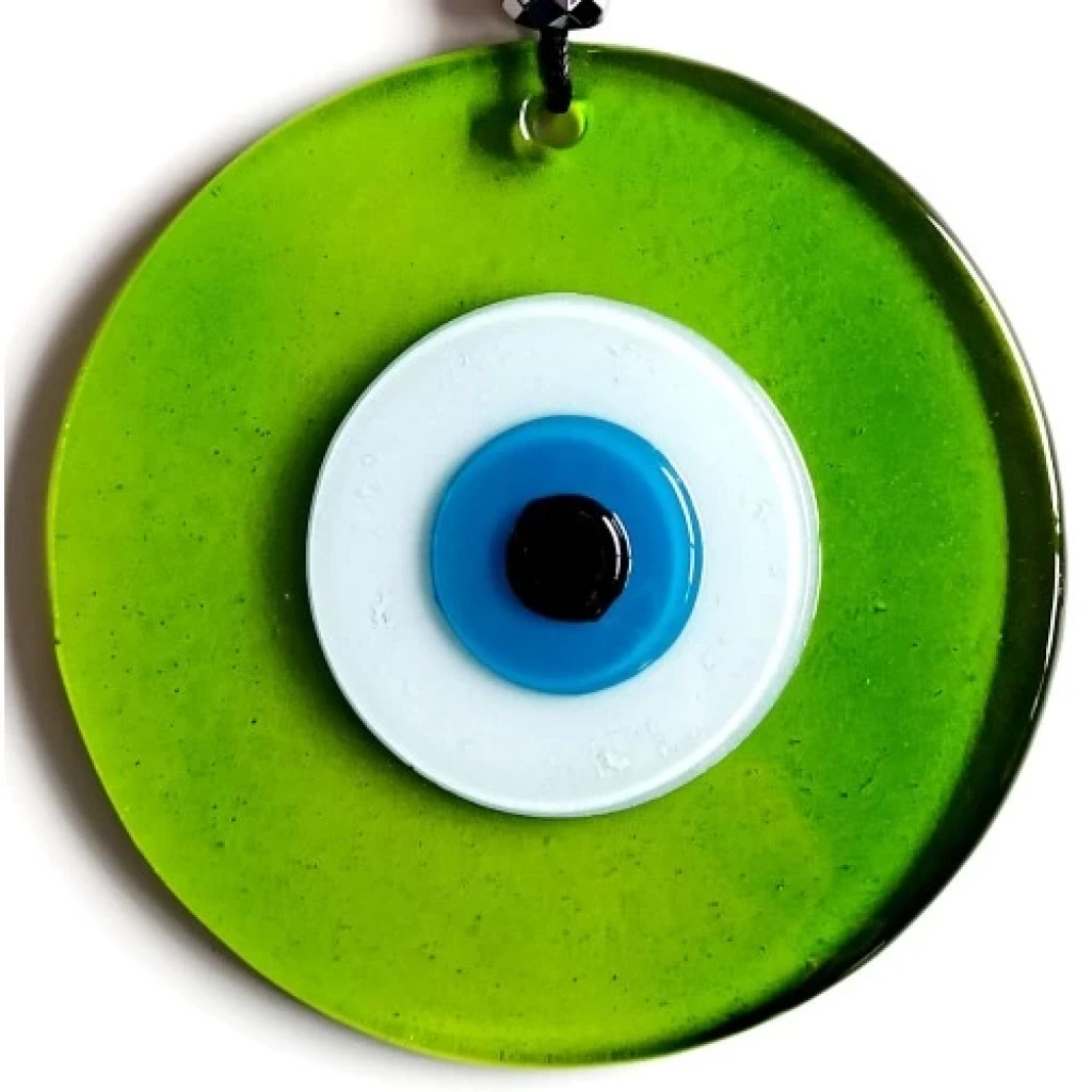 Mavi nazar boncuklu şeffaf yeşil duvar süsümüz 12 santimetre çapındadır. Ürünümüz ip dahil 22 santimetre boyundadır. Tamamen el işçiliği ile üretilmiştir. Ürünümüz birinci kalite camdan, birinci kalite işçilikle hazırlanmıştır.
