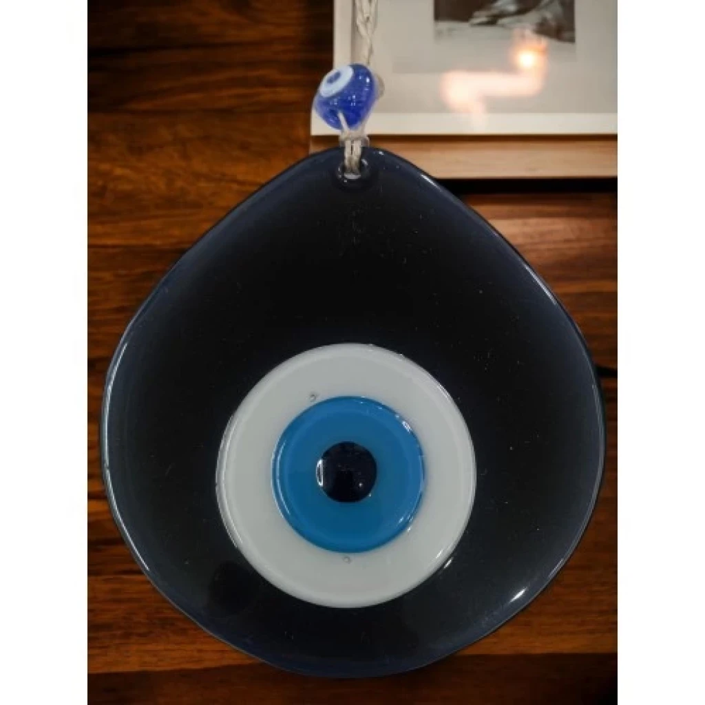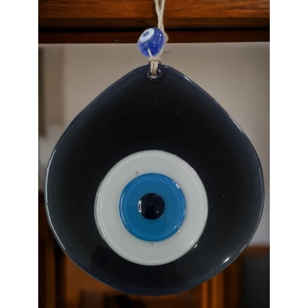 Siyah renk nazar boncuklu duvar süsümüz tamamen el işçiliği ile üretilmiştir. Tasarım harikası el yapımı nazar boncuklu duvar süsümüz 13 x 12 santimetre ölçülerindedir. Ürünümüz ip dahil 21 santimetre boyundadır.
