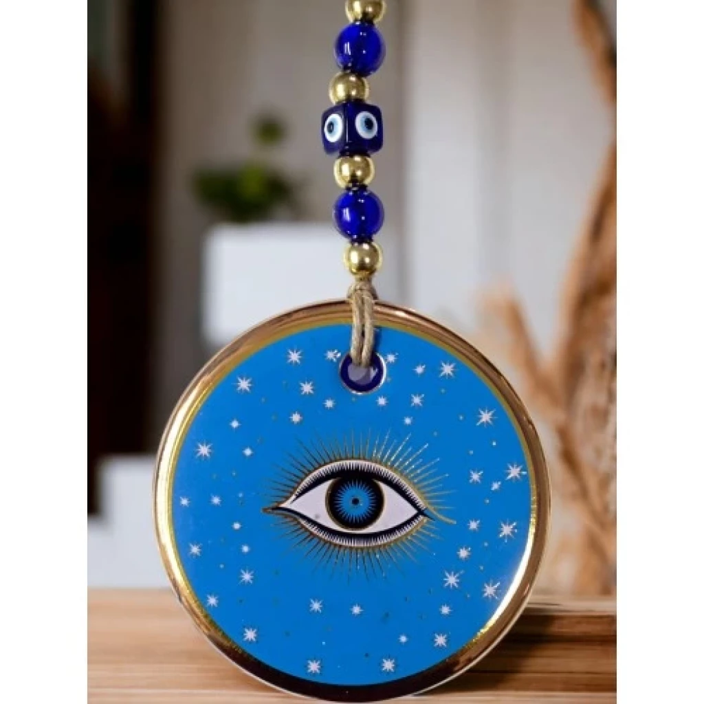 Mavi renk yıldız motifli göz süsümüz nazar boncuğu ile süslenmiştir. Ürünümüz mavi cam nazar boncuğundan tamamen el işçiliği ile üretilmiştir. Ürünümüzün yuvarlak kısmı 13 santimetre çapındadır. Duvar süsümüz ip dahil yaklaşık 30 santimetre boyundadır.