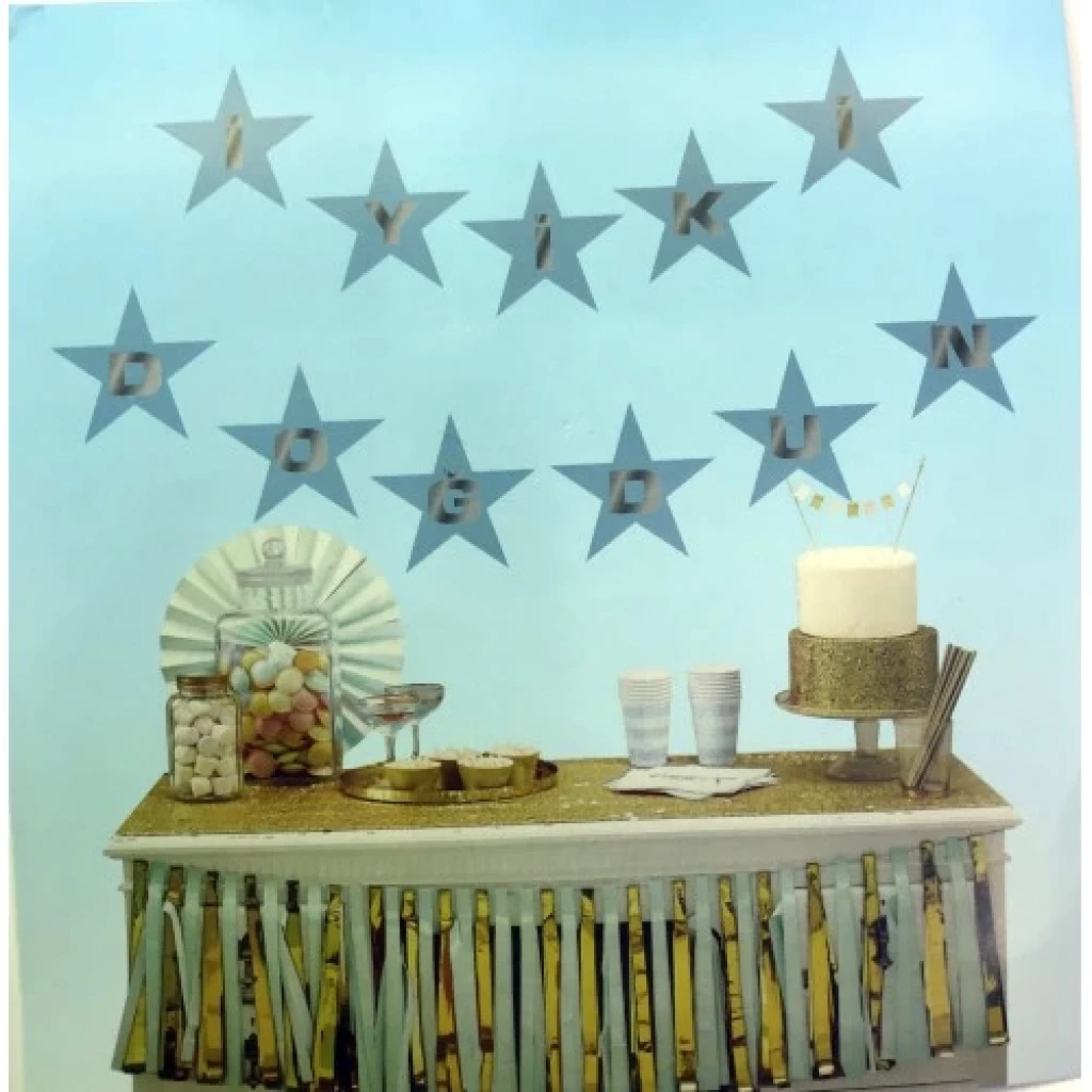 MAVİ ÜZERİ GÜMÜŞ YILDIZ İYİKİ DOĞDUN FLAMA SÜSÜrün ÖzellikleriMavi renkli flama süsÜzerinde gümüş yıldız detayları"İyi ki doğdun" yazılı tasarımDoğum günü partileri ve özel etkinlikler için mükemmelKolay kurulum ve uzun ömürlü kullanımPAKET İÇERİĞİ1 adet mavi üzeri gümüş yıldız "İyi ki doğdun" flama süs