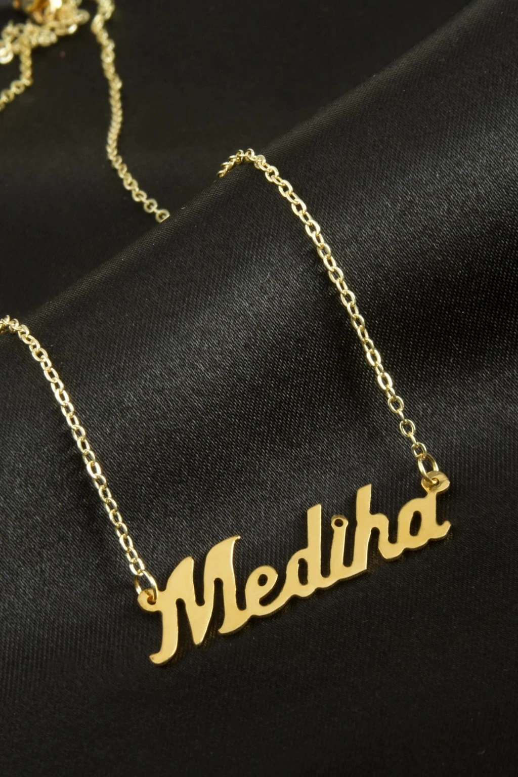 Mediha İsimli Kolye. İsimli kolye pirinç madeninden ve altın kaplamalıdır. Kişiye özel üretilmektedir.Yazdırmak istediğiniz ismi bize mesaj olarak iletmeniz gerekmektedir. Kullanıma bağlı olarak uzun süre kullanıma uygundur. Ürün malzemesi 1.sınıf kalitededir. Ürün ve zinciri sarı renktedir. Ürün zincir boyu 45 cm ve ürün üzerindeki isimler yaklaşık 3 cmdir. İsim boyları ürün ismine göre degişiklik göstermektedir.