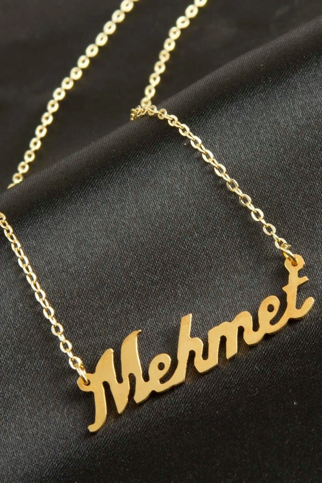 Mehmet İsimli Kolye. İsimli kolye pirinç madeninden ve altın kaplamalıdır. Kişiye özel üretilmektedir.Yazdırmak istediğiniz ismi bize mesaj olarak iletmeniz gerekmektedir. Kullanıma bağlı olarak uzun süre kullanıma uygundur. Ürün malzemesi 1.sınıf kalitededir. Ürün ve zinciri sarı renktedir. Ürün zincir boyu 45 cm ve ürün üzerindeki isimler yaklaşık 3 cmdir. İsim boyları ürün ismine göre degişiklik göstermektedir.