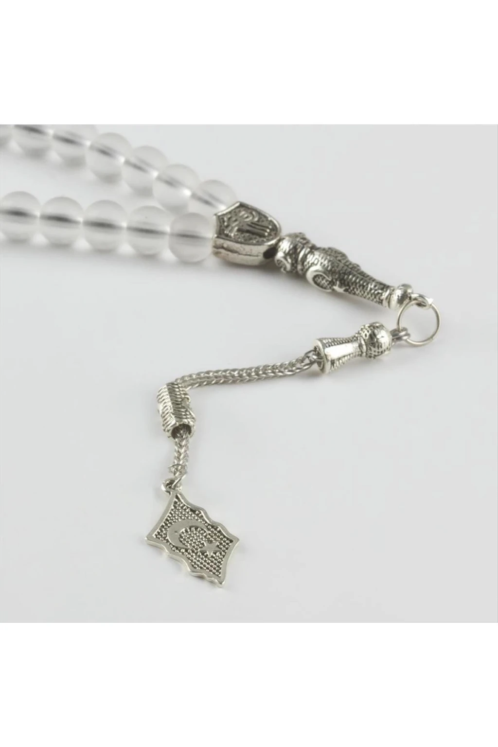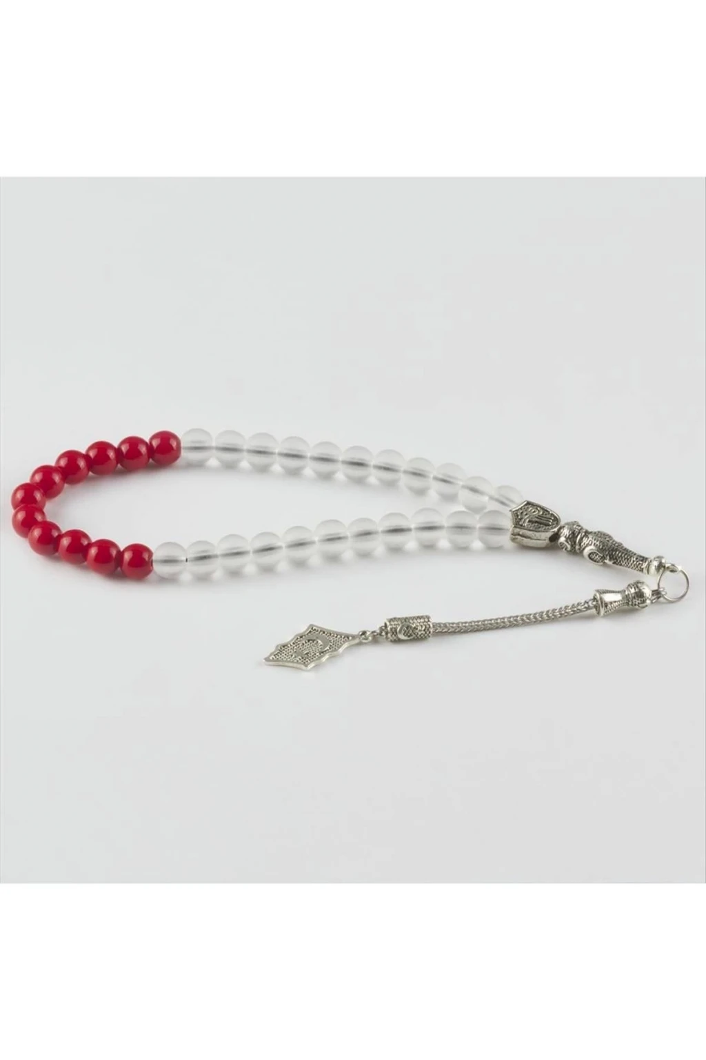 Tesbih; Buzlu Kuvars ve Mercan taşından imal edilmiştir. Ürün yapısı parlakdır. Püskül kararma yapmaz. Taşlar misina üzerine dizilmişdir.Taş boyutu 8 mm'dir.