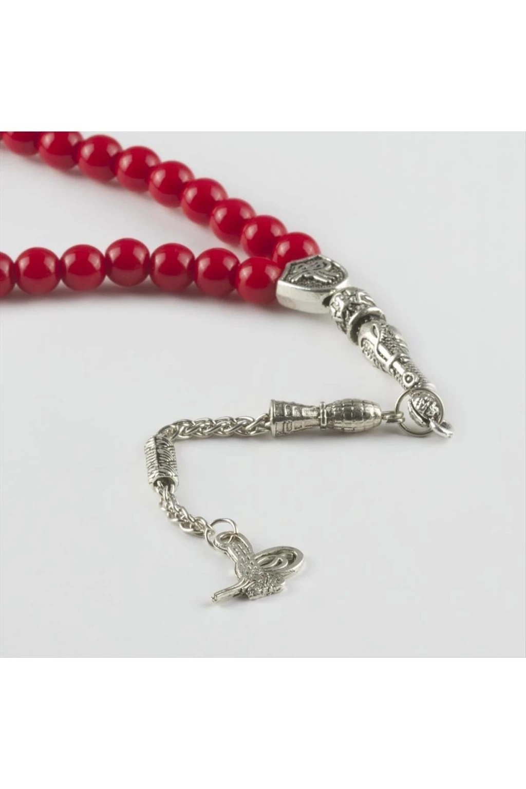 Tesbih; Mercan taşından imal edilmiştir. Ürün yapısı parlakdır. Püskül kararma yapmaz. Taşlar misina üzerine dizilmişdir.Taş boyutu 8 mm'dir.