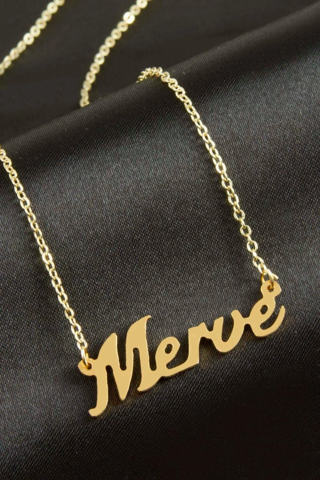 Merve isimli kolye. İsimli kolye pirinç madeninden ve altın kaplamalıdır. Kişiye özel üretilmektedir.Yazdırmak istediğiniz ismi bize mesaj olarak iletmeniz gerekmektedir. Kullanıma bağlı olarak uzun süre kullanıma uygundur. Ürün malzemesi 1.sınıf kalitededir. Ürün ve zinciri sarı renktedir. Ürün zincir boyu 45 cm ve ürün üzerindeki isimler yaklaşık 3 cmdir. İsim boyları ürün ismine göre degişiklik göstermektedir.