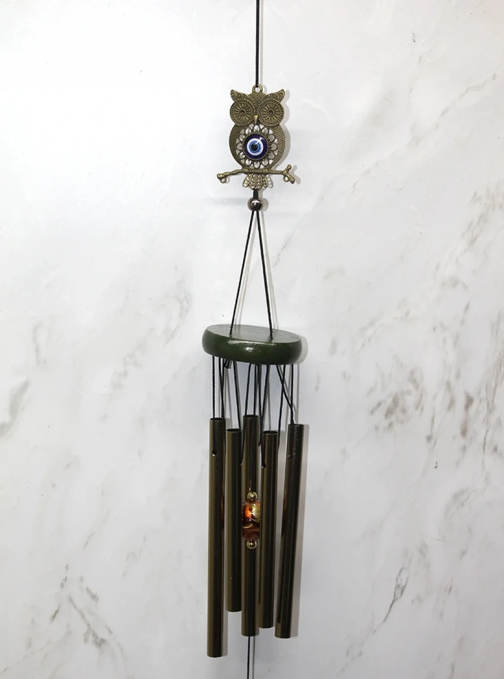 METAL RÜZGAR ÇANI MODEL 12Ürün ÖzellikleriMetal Rüzgar Çanı Model 12, zarif ve estetik tasarımıyla ev, balkon veya bahçenize huzurlu bir atmosfer katar. Üzerindeki baykuş figürü ve nazar boncuğu detayı, kötü enerjiyi uzaklaştırdığına inanılan geleneksel bir sembol ile birleşerek dekoratif bir obje sunar. Metal boruları hafif rüzgarla hareket ederek rahatlatıcı bir melodi oluşturur. Dayanıklı malzemesi sayesinde uzun ömürlüdür ve iç ve dış mekân kullanımı için uygundur.Paket İçeriği1 Adet Metal Rüzgar Çanı