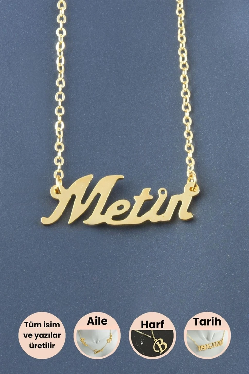Metin İsimli Kolye; İsimli kolye pirinç madeninden ve altın kaplamalıdır. Kişiye özel üretilmektedir. Yazdırmak istediğiniz ismi bize mesaj olarak iletmeniz gerekmektedir. Kullanıma bağlı olarak uzun süre kullanıma uygundur. Ürün malzemesi 1.sınıf kalitededir. Ürün ve zinciri sarı renktedir. Ürün zincir boyu 45 cm ve ürün üzerindeki isimler yaklaşık 3 cmdir. İsim boyları ürün ismine göre degişiklik göstermektedir.