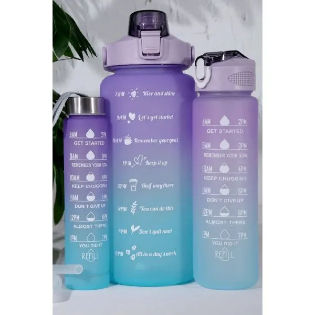 MOTİVASYON SULUK SETİÜrün ÖzellikleriSağlıklı Tritan malzemeden üretilmiştir.BPA, Fitalat ve toksit madde içermez, koku yapmaz, çocukların ve yetişkinlerin sağlığı için kesinlikle güvenlidir.BPA ve toksin içermez, son derece dayanıklı ve BPA içermeyez Lütfen bulaşık makinesinde veya sıcak su ile yıkamayınız..Kapağı 2 kademeli açılmaktadır, kapağı sonuna kadar ittirin, kapak sabitlenecektir.Böylelikle suyunuzu daha rahat içebilirsiniz.2.000 ML - 750 ML- 300 ML 3 lü set motivasyonel zaman çizelgeli su matarası bir günlük su ihtiyacınızın tamamını karşılar.Ilham verici alıntılar ve net zaman işaretçisi ile bu su matarası günlük su alımını izlemek ve gün boyunca su tüketimini teşvik etmek için harikadır.Birbirinden farklı canlı renk tasarımlarıyla yalnızca kendiniz için değil, aynı zamanda sevdikleriniz için güzel bir hediyedir.Bu uzun ömürlü su matarası sayesinde günlük pet şişe kullanımınızı azaltabilirsiniz.2.000 ML - 750 ML- 300 ML 3 lü set su matarası, suyunuzu günde birçok kez yeniden doldurmak zorunda kalma sorununu çözer.tasarımı sayesinde su akıtmaz akıntı yapmaz, farklı kullanım seçenekleri ile pipetli veya pipetsiz olarak kullanılabilir, özel sapı ile her yere kolaylıkla taşınabilir.Paket İçeriği3 lü motivasyon suluk seti