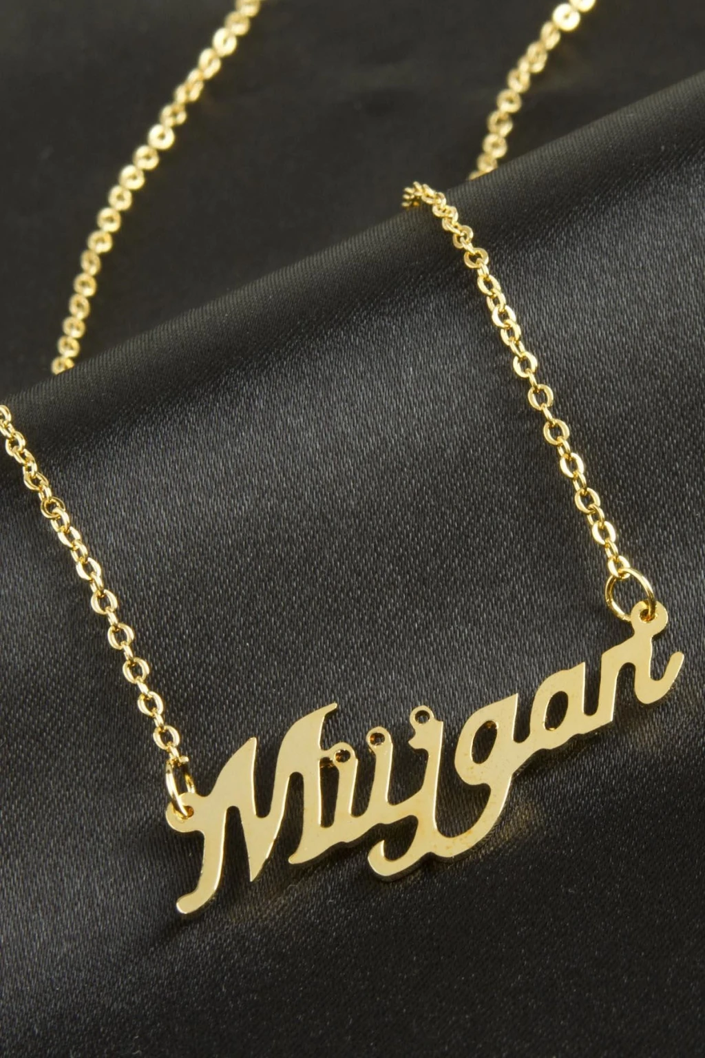 Müjgan isimli kolye. İsimli kolye pirinç madeninden ve altın kaplamalıdır. Kişiye özel üretilmektedir.Yazdırmak istediğiniz ismi bize mesaj olarak iletmeniz gerekmektedir. Kullanıma bağlı olarak uzun süre kullanıma uygundur. Ürün malzemesi 1.sınıf kalitededir. Ürün ve zinciri sarı renktedir. Ürün zincir boyu 45 cm ve ürün üzerindeki isimler yaklaşık 3 cmdir. İsim boyları ürün ismine göre degişiklik göstermektedir.