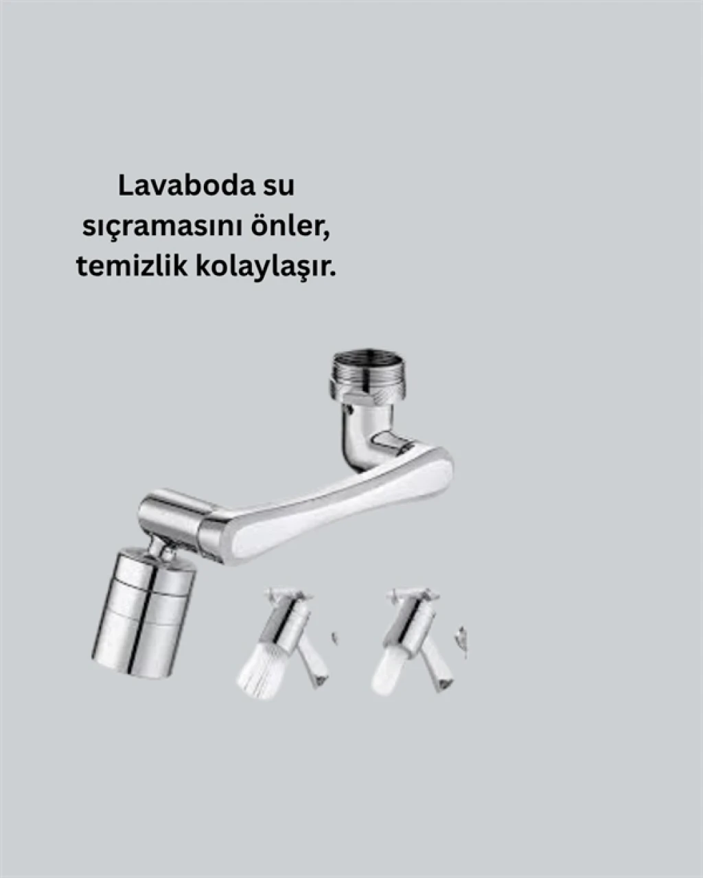 Günlük kullanım için geliştirilmiş olan bu 1080° dönebilen musluk başlığı, evinizdeki lavabo ve muslukları çok daha işlevsel hale getiriyor. Üç eklemli robotik kol sistemi sayesinde toplamda 1080° dönme kapasitesine sahiptir. Bu özel yapı, musluğunuzun sabit yönlü su akışını sınırlamaktan çıkarır, dilediğiniz yöne kolayca yönlendirebilmenizi sağlar. Yukarı, aşağı, sağa veya sola… Suyun nereye akacağını artık siz belirlersiniz.Bu fonksiyonel tasarım, yalnızca konfor sağlamakla kalmaz, temizlik ve hijyen açısından da büyük kolaylık sunar. Yüz yıkama, saç durulama, sebze-meyve temizliği, lavabo içi ve kenarlarının yıkanması gibi işlemler artık çok daha zahmetsiz hale gelir. Özellikle çocuklar, yaşlılar ve engelli bireyler için oldukça ergonomik bir kullanım deneyimi sunar.Cihaz, iki farklı su akışı modu ile donatılmıştır:Köpüklü Akış (Soft Mode): Oksijenle zenginleştirilmiş yumuşak su akışıyla ellerinizi ve yüzünüzü daha konforlu şekilde yıkayabilirsiniz.Güçlü Sprey Modu: Yüksek basınçlı, geniş yüzeyli akışla lavabo, bulaşık veya sebzeleri hızlı ve etkili şekilde durulayabilirsiniz.Modlar arasında geçiş yapmak son derece basittir; başlığın ucundaki halka çevirilerek anında değiştirilebilir.Ürün yalnızca pratik değil, aynı zamanda dayanıklıdır. Katı pirinç gövdesi, uzun ömürlü kullanım sunar ve paslanmaya karşı yüksek dirençlidir. İç kısmındaki 4 katmanlı filtre sistemi, musluk suyunu daha sağlıklı hale getirir; partikülleri ve kirliliği süzerek temiz akış sağlar.Kurulum için ekstra araç gerekmez. Ürün, standart musluklara uygundur ve kutu içeriğinde yer alan adaptör sayesinde farklı diş yapılarıyla da kolayca uyum sağlar. Tak-çalıştır mantığıyla birkaç dakikada monte edebilirsiniz.Sonuç: Hem modern tasarımıyla evinizin şıklığını bozmayan hem de fonksiyonelliğiyle gündelik hayatı kolaylaştıran bu musluk başlığı; mutfak, banyo ve ofis lavaboları için akıllı ve ekonomik bir tercihtir.