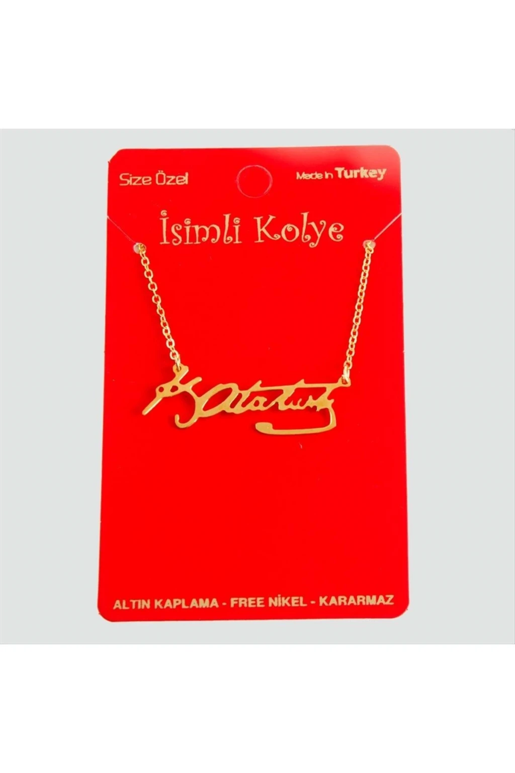 Kolye, Ürünlerimiz pirinç kesim olup , altın kaplamadır. kararma yapmaz. Ürün zincir boyu 45 cmdir. Ürün ucundaki aparat boyu 3,5 cmdir.