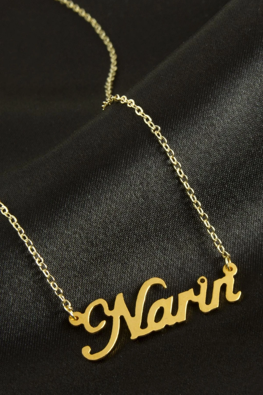 Narin isimli kolye. İsimli kolye pirinç madeninden ve altın kaplamalıdır. Kişiye özel üretilmektedir.Yazdırmak istediğiniz ismi bize mesaj olarak iletmeniz gerekmektedir. Kullanıma bağlı olarak uzun süre kullanıma uygundur. Ürün malzemesi 1.sınıf kalitededir. Ürün ve zinciri sarı renktedir. Ürün zincir boyu 45 cm ve ürün üzerindeki isimler yaklaşık 3 cmdir. İsim boyları ürün ismine göre degişiklik göstermektedir.