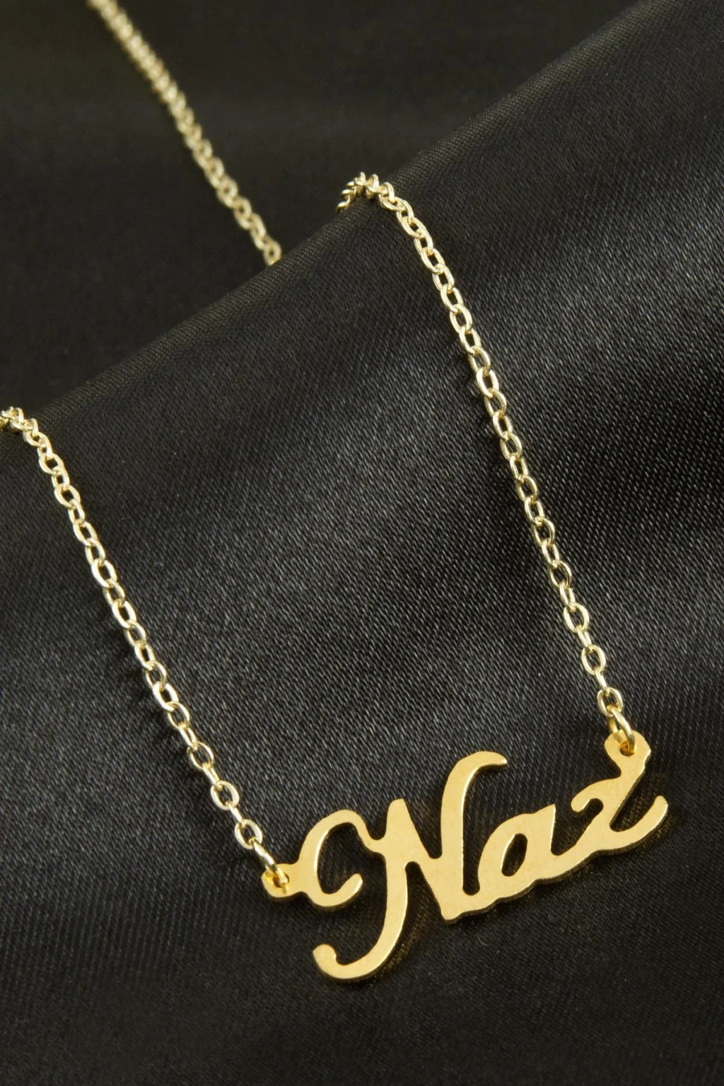 Naz isimli kolye. İsimli kolye pirinç madeninden ve altın kaplamalıdır. Kişiye özel üretilmektedir.Yazdırmak istediğiniz ismi bize mesaj olarak iletmeniz gerekmektedir. Kullanıma bağlı olarak uzun süre kullanıma uygundur. Ürün malzemesi 1.sınıf kalitededir. Ürün ve zinciri sarı renktedir. Ürün zincir boyu 45 cm ve ürün üzerindeki isimler yaklaşık 3 cmdir. İsim boyları ürün ismine göre degişiklik göstermektedir.