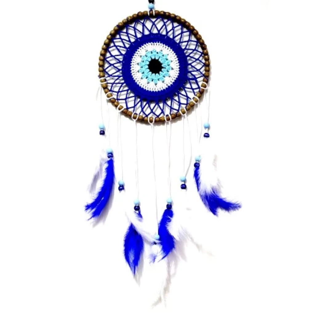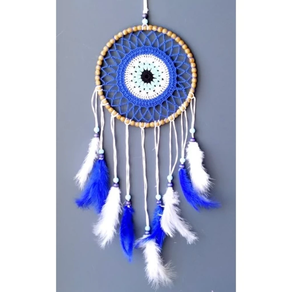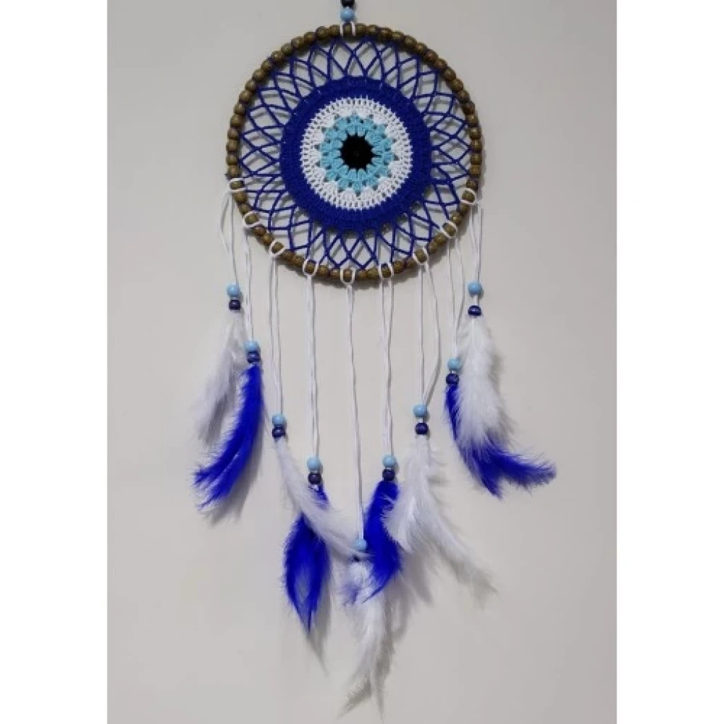 Nazar boncuğu motifli ürünümüz el yapımıdır. Ürünümüzün yuvarlak kısmı 22 santimetre çapındadır. Ürünümüz asma ipi dahil 70 santimetre boyundadır. Duvar süsümüz beyaz ve lacivert kuş tüyleri ile süslenmiştir. Duvar süsümüzü en özel köşelerinizde kullanmak için ya da hediye etmek için tercih edebilirsiniz.
