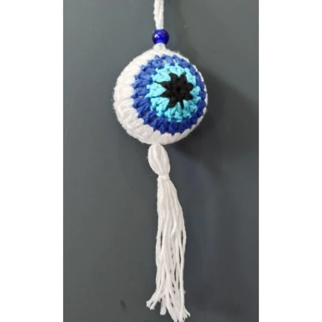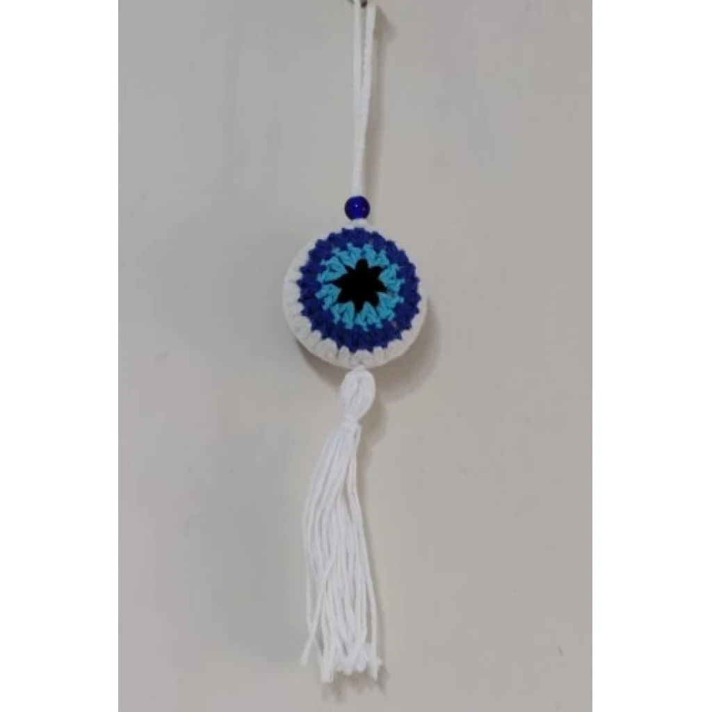 Nazar boncuğu desenli el örgüsü ürünümüz beyaz orlon ip ile üretilmektedir. Püsküllü araba süsümüzün yuvarlak kısmı 7 santimetre çapındadır. Ürünümüz 23 santimetre boyundadır.