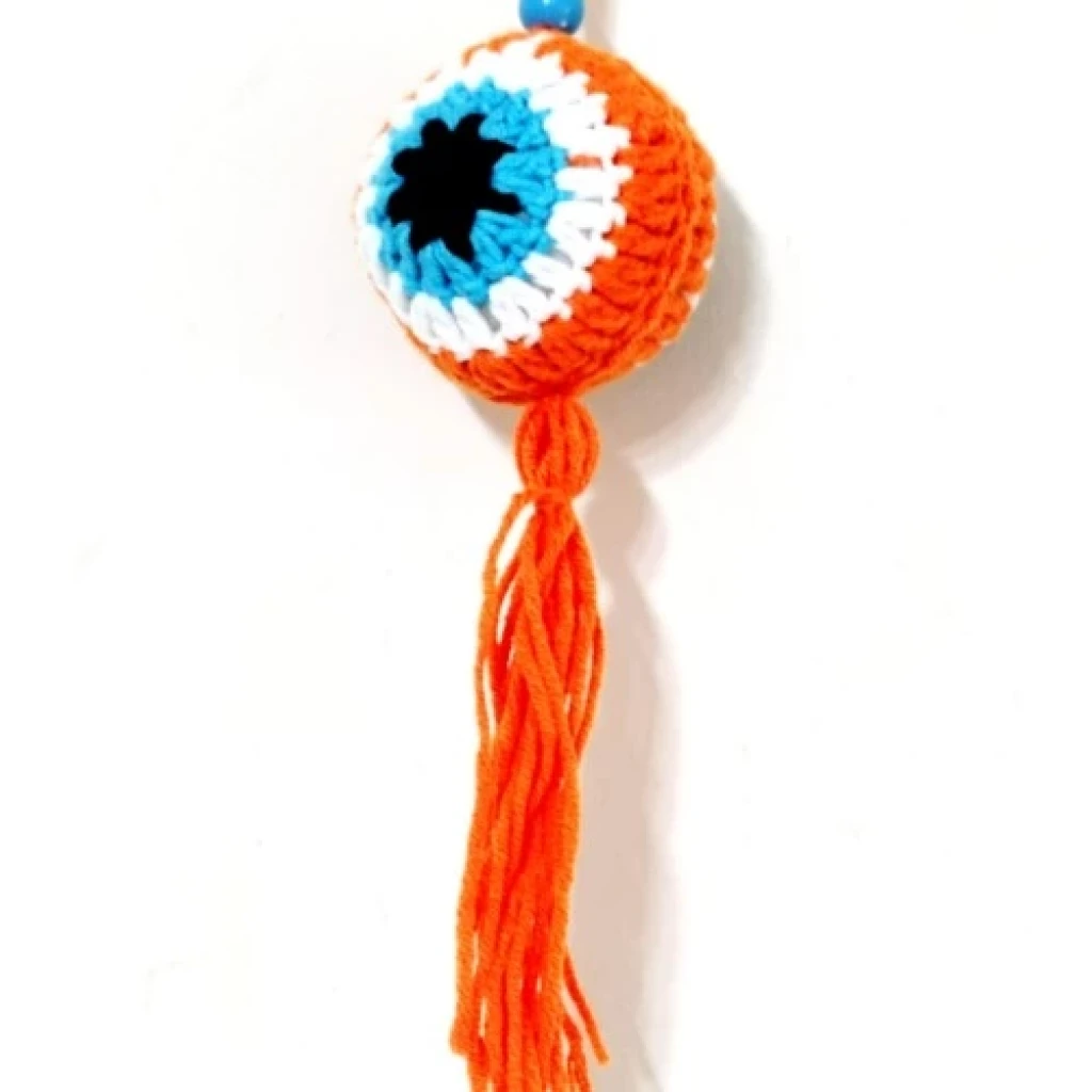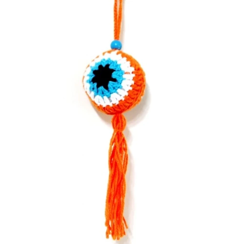 Nazar boncuğu desenli el örgüsü ürünümüz turuncu orlon ip ile üretilmektedir. Püsküllü araba süsümüzün yuvarlak kısmı 7 santimetre çapındadır. Ürünümüz 23 santimetre boyundadır.