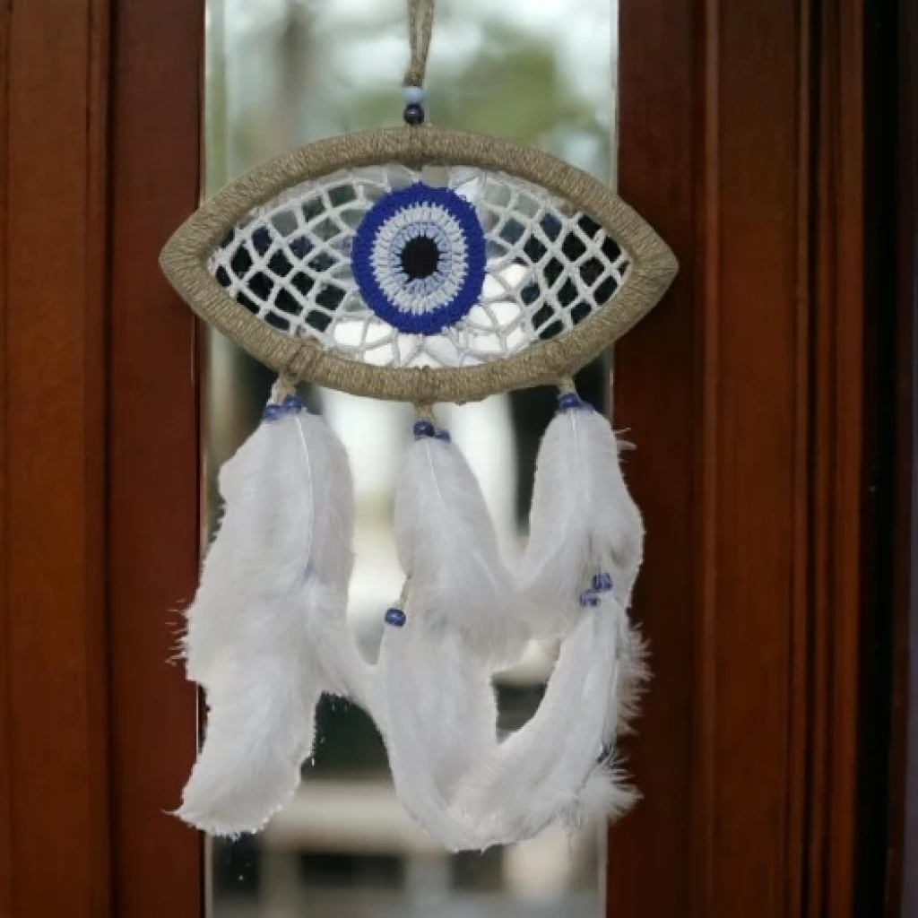 Nazar Boncuğu Motifli Göz Model Duvar Süsü El İşçiliği Duvar DekoruÜrünümüz tamamen el işçiliği ile üretilmektedir.Ürün Ebatları:Genişliği: 25 cmUzunluğu: 13 cmİp Dahil Uzunluğu: 45 cm