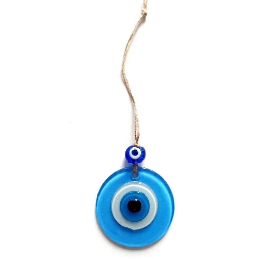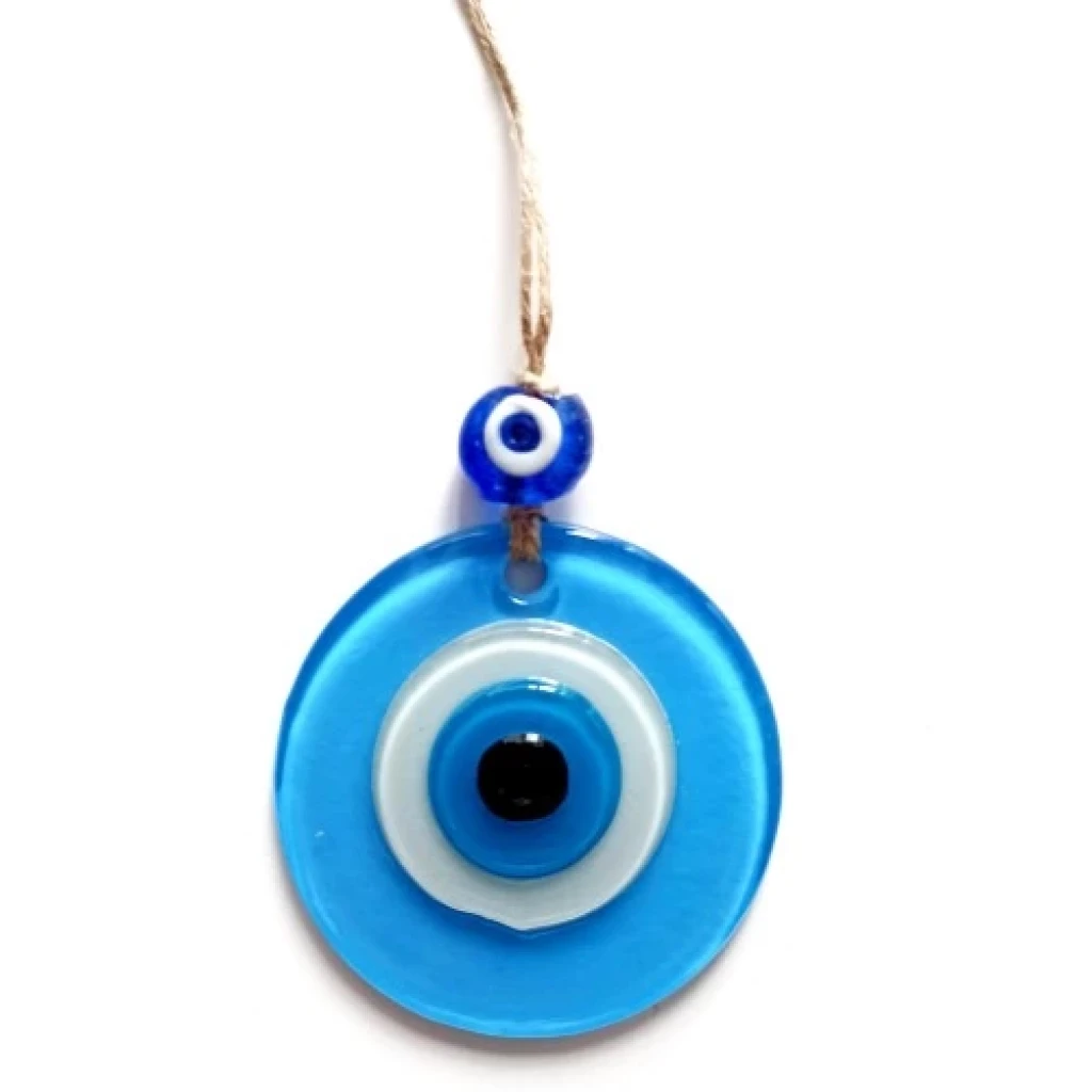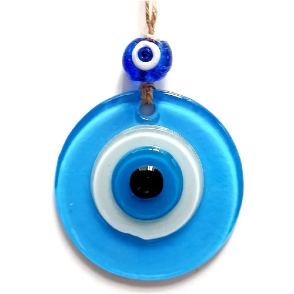 Nazar boncuklu ürünümüz bebek mavisi rengindedir. Mini cam duvar süsümüz 7 santimetre çapındadır. Ürünümüz ip dahil 23 santimetre boyundadır.