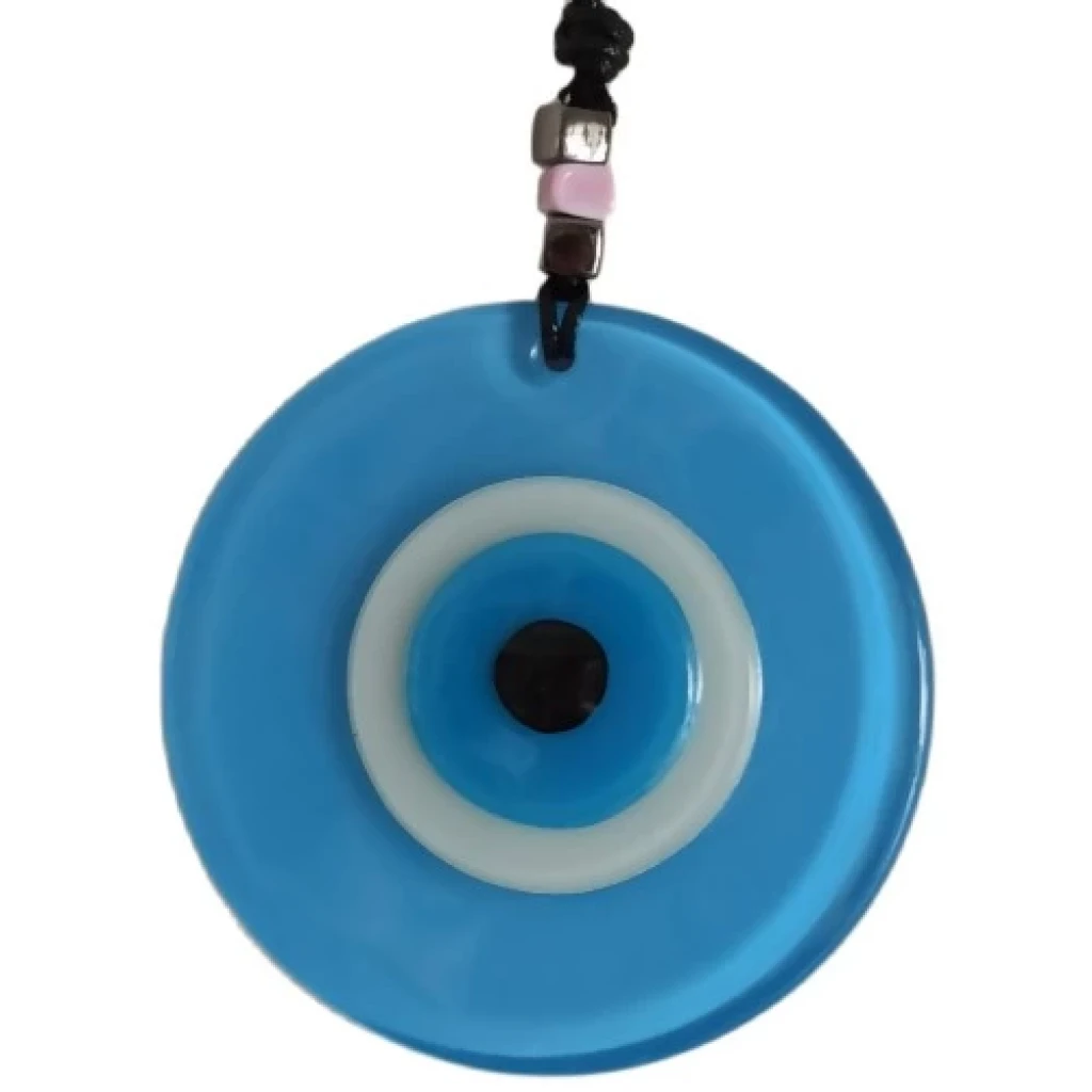 Nazar boncuklu ürünümüz Bebe mavisi rengindedir. Ürünümüz 12 santimetre çapındadır. Ürünümüz ip dahil 19 santimetre boyundadır. Ürünümüz cam malzemeden üretilmektedir.