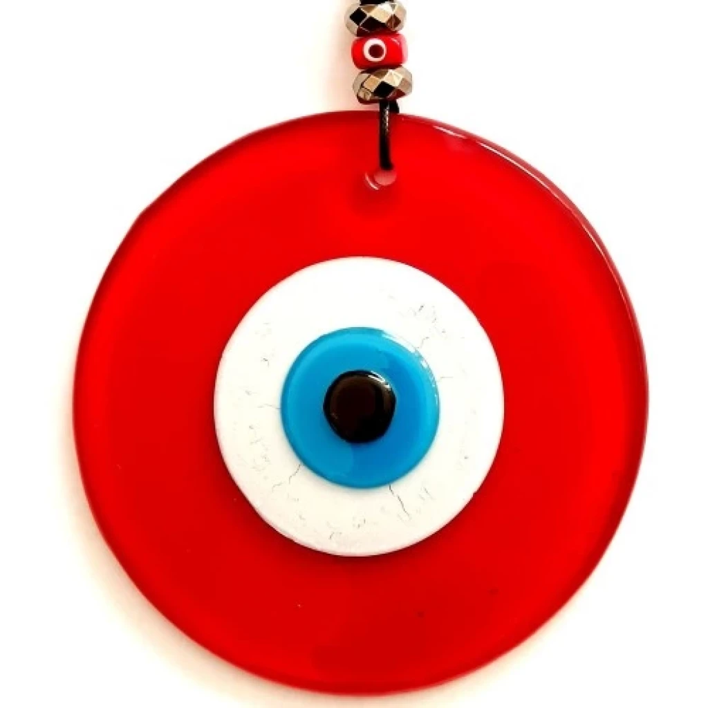 Nazar boncuklu, deri ipli ve küçük nazar boncuk detaylı tamamen el işçiliği ile üretilmiş duvar süsümüz 12 x 12 santimetre ölçülerindedir. İp dahil 26 santimetre boyundadır.