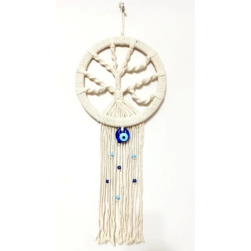 Nazar boncuklu makrome duvar süsümüz hayat ağacı şekillidir. Ürünümüzün yuvarlak kısmı 28 santimetre çapındadır. Duvar süsümüzü ip dahil 70 santimetre boyundadır. Ürünümüz ekru renk olup üzerindeki nazar boncuğu camdır.