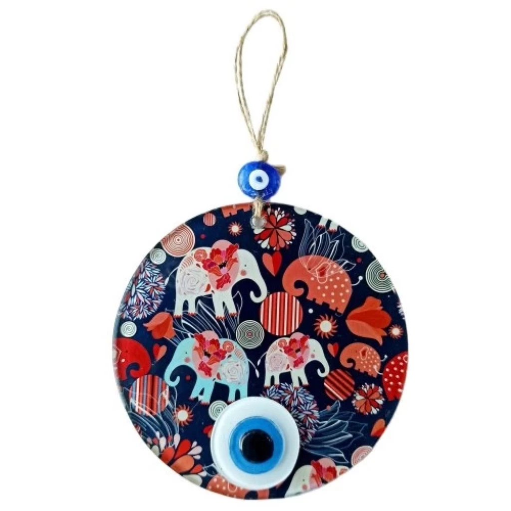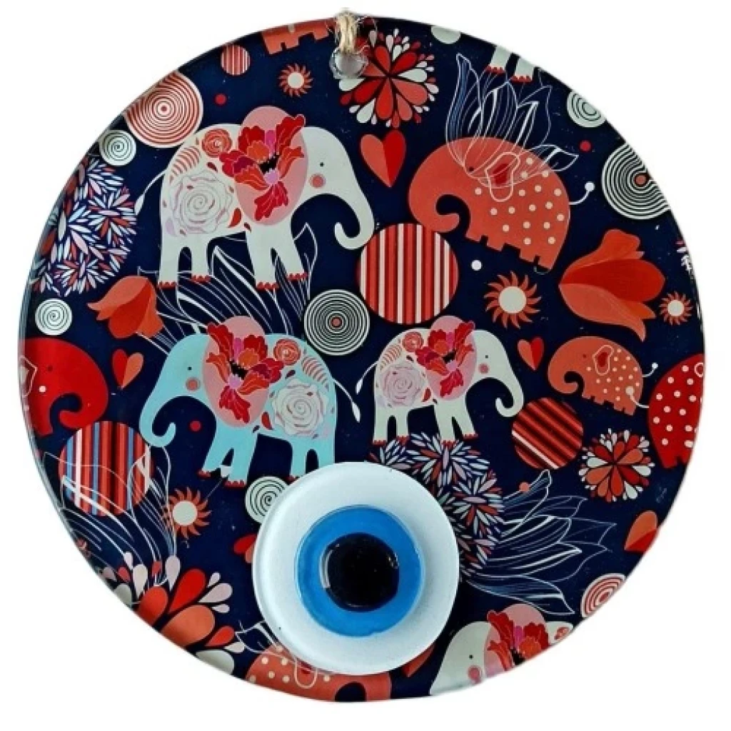 Nazar boncuklu fil desenli duvar süsümüz 15 santimetre çapındadır. Ürünümüz ip dahil yaklaşık 32 santimetre boyundadır. Ürünümüz füzyon cam malzemeden üretilmektedir.