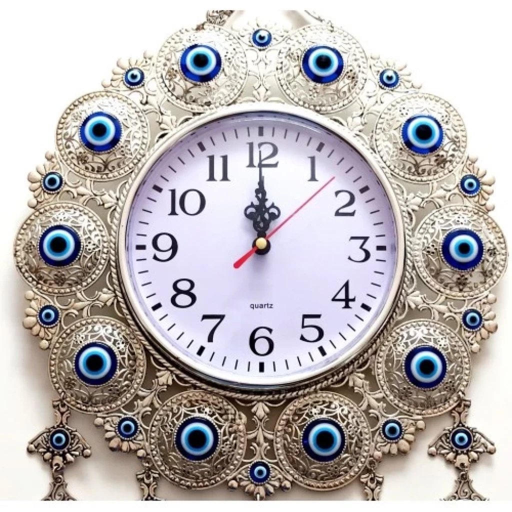 Gümüş kaplama mavi nazar boncuklu duvar saatimiz zamanla kararma veya bozulma yapmaz gümüş kaplama duvar saatimizin eni 28 santimetre, boyu 47 santimetredir.