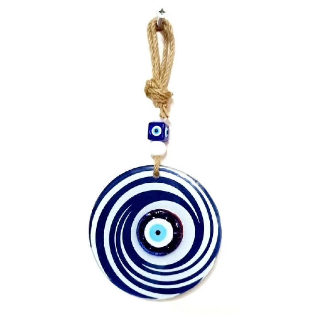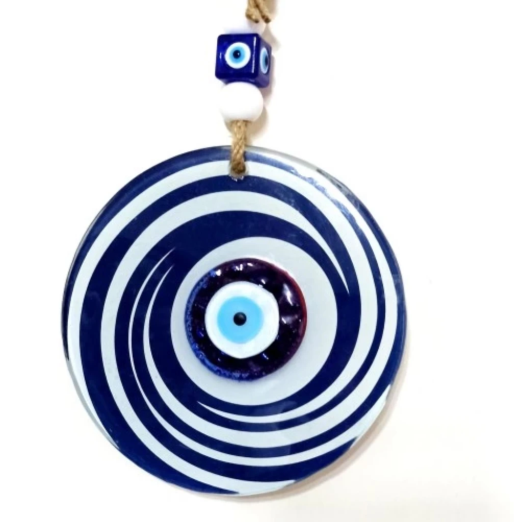Nazar boncuklu lacivert ve beyaz renkli duvar süsümüz füzyon cam malzeme kullanılarak üretilmektedir. Duvar süsümüz 12 santimetre çapındadır. Cam duvar süsümüz ip dahil 26 santimetre boyundadır.