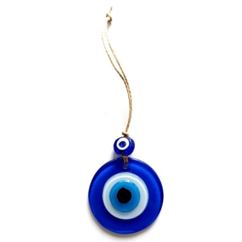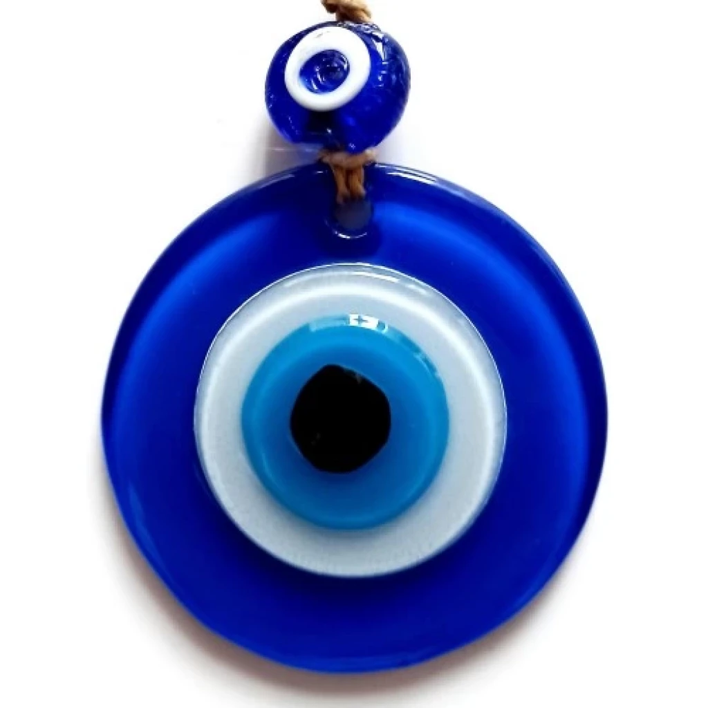 Nazar boncuklu ürünümüz mavi renktir. Mini cam duvar süsümüz 7 santimetre çapındadır. Ürünümüz ip dahil 23 santimetre boyundadır.