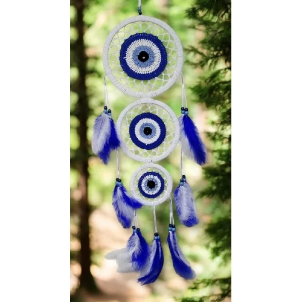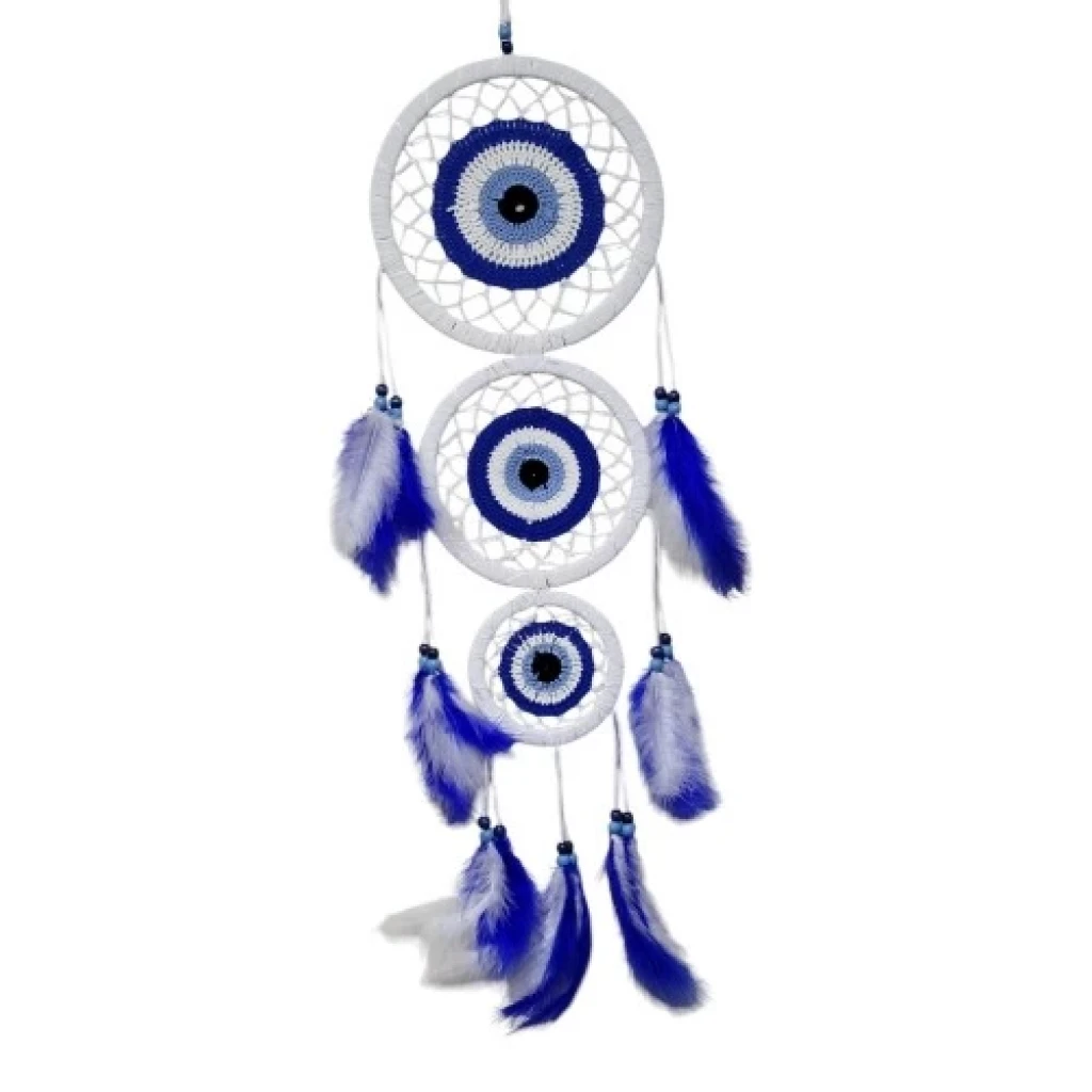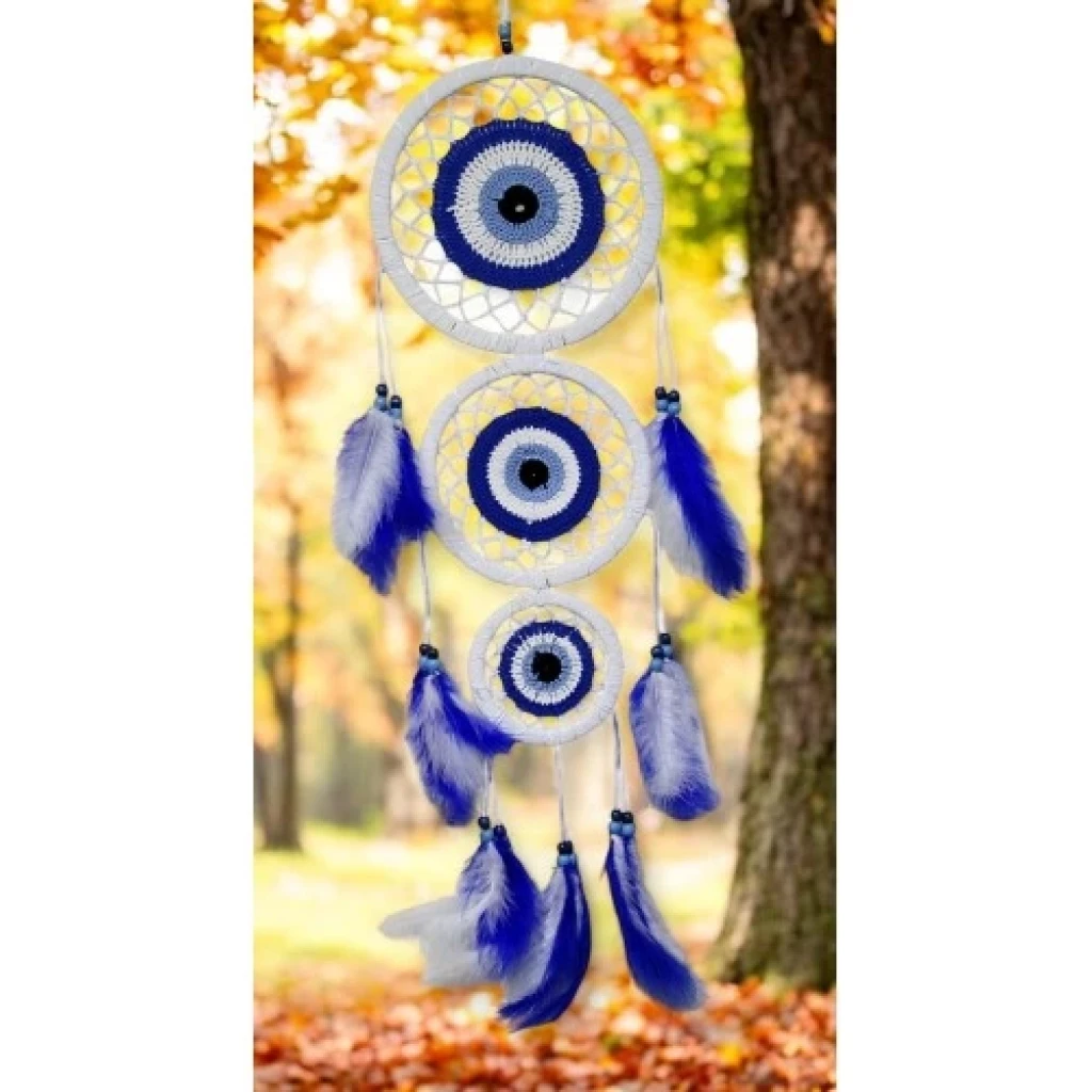 Nazar Motifli Üç Çemberli Kuş Tüylü Beyaz Duvar Süsü