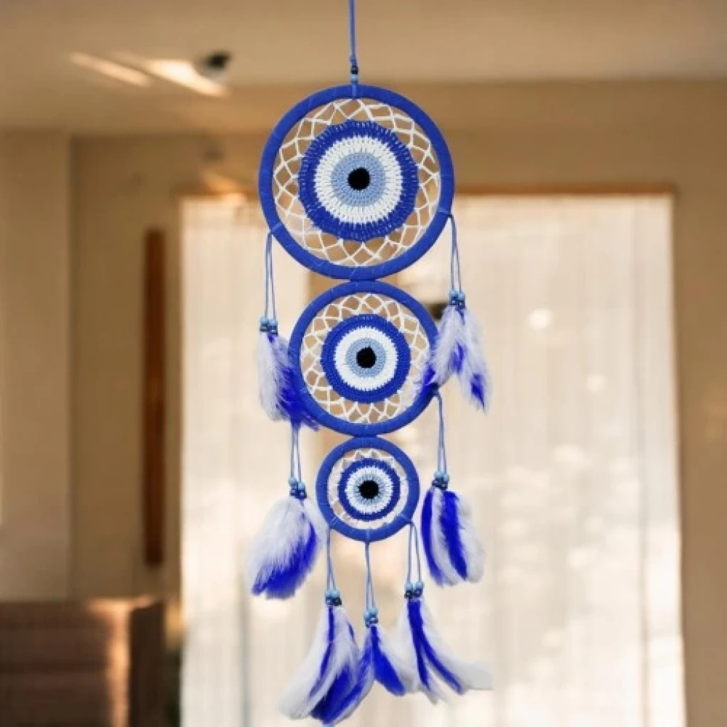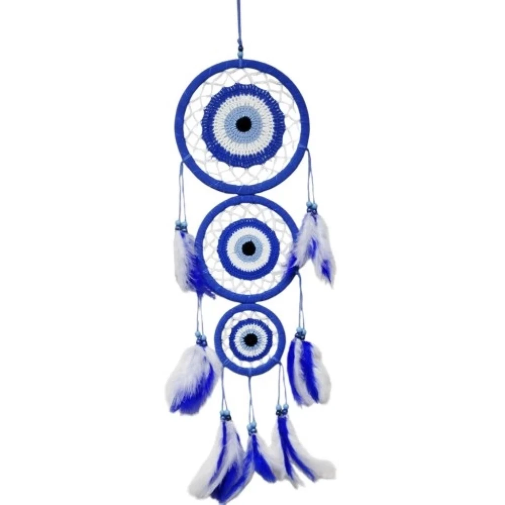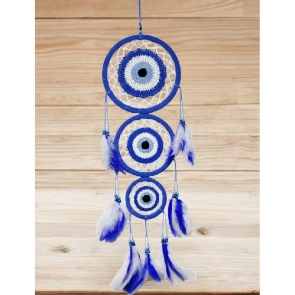 Nazar Motifli Üç Çemberli Kuş Tüylü Mavi Duvar Süsü